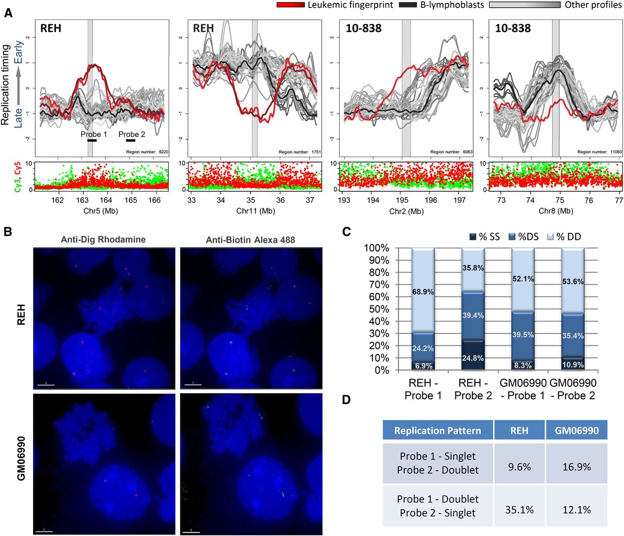 Replication-timing differences in karyotypically normal regions. (A) Shown are sample-specific fingerprint regions in cell line REH and patient 10-838 that lack genetic lesions under karyotypic analysis (both samples, with 10-838 being karyotypically normal), total Cy3 + Cy5 intensity (both samples) or Sanger CGH (REH), and therefore represent apparently epigenetic timing changes. Such regions may be explained by changes in long-range interactions or by subkaryotypic or CGH-resolution rearrangements. As in Figure 4, fingerprint profiles (REH or 10-838) are highlighted (red) against a background of other leukemic samples (gray) and B-lymphoblastoid cells (black). (B) Fluorescent in situ hybridization images of cell lines REH and GM06990 showing region-specific binding in metaphase nuclei and doublet/singlet hybridization patterns in interphase nuclei. (C) Quantification of observed singlet/singlet (SS), doublet/singlet (DS), and doublet/doublet (DD) configuration of allelic homologs for each probe shown in A. Only nuclei displaying at least one doublet allele (189 GM06990 and 296 REH) in either probe were scored, which may exaggerate the percentage of nuclei that appear to have replicated the regions asynchronously (single-doublets). (D) Quantification of the frequency with which one probe appeared to replicate prior to the other as a percentage of total chromosomes scored for which cis-linked probes 1 and 2 show a singlet–doublet configuration (378 GM06990 and 592 REH). In REH, probe 1 appears to replicate prior to probe 2 nearly 75% of the time, whereas in GM06990 either probe may replicate first.