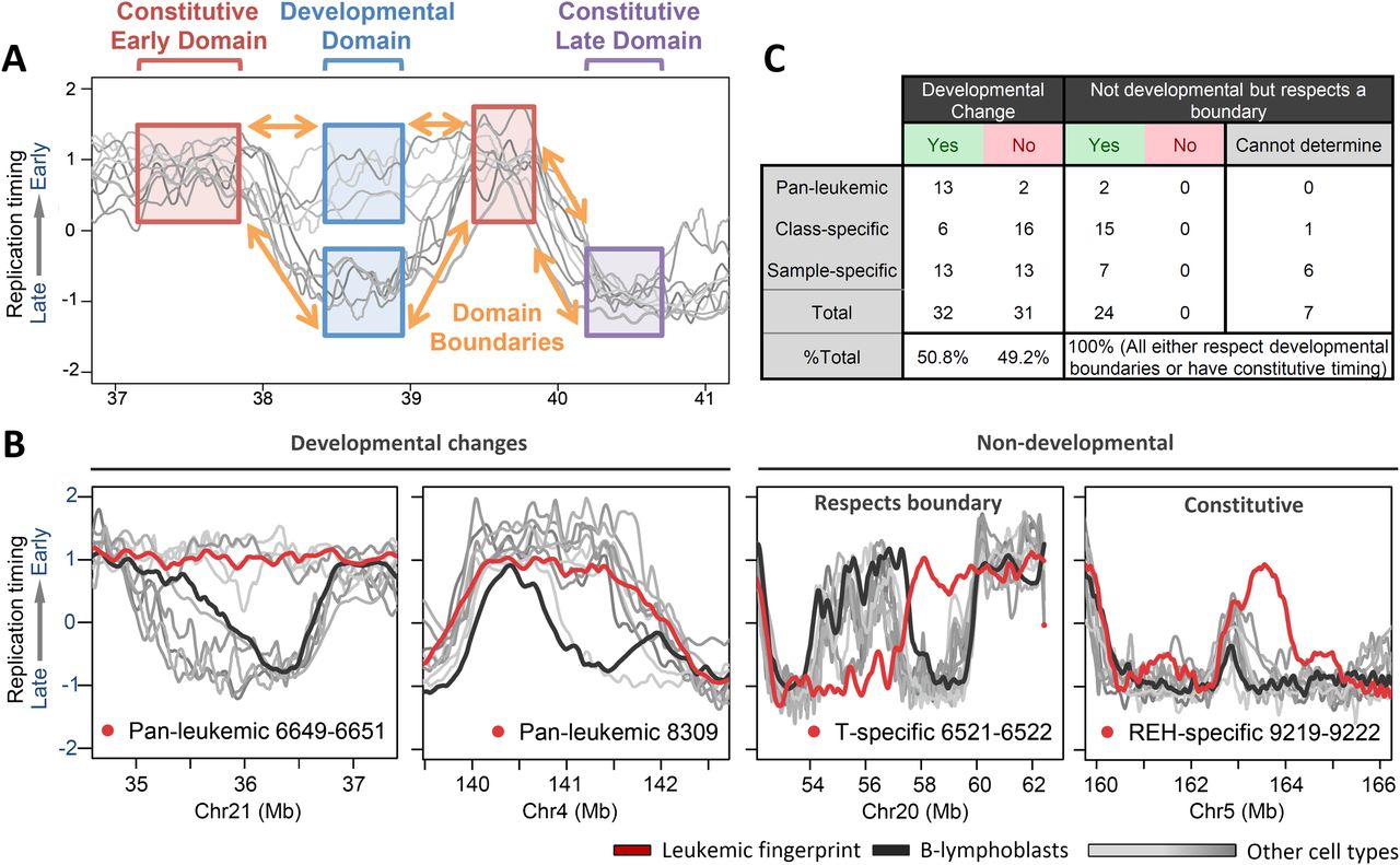 Replication changes in leukemia respect normal developmental boundaries. (A) Diagram of normal boundaries of replication in development, defining regions of constitutively early or late replication timing, conserved boundaries between these regions, and developmentally regulated domains. (B). Examples of each class of domains in leukemic fingerprints that switch replication timing (red) against a background of other human cell types (gray) and normal B-cell controls (black). Here, two pan-leukemic fingerprint regions align to both developmental boundaries and timing values. T-cell profiles switch timing in opposite directions from others, but at the same transition region as is used in B cells and other cell types, while an REH-specific fingerprint region aligns to one boundary but switches earlier than other cell types profiled. Additional examples of domain boundary alignment are shown in Supplemental Figure S10. (C) A summary of the number of domains in leukemic fingerprints that align to developmental boundaries, either with or without acquiring the timing of other cell types.