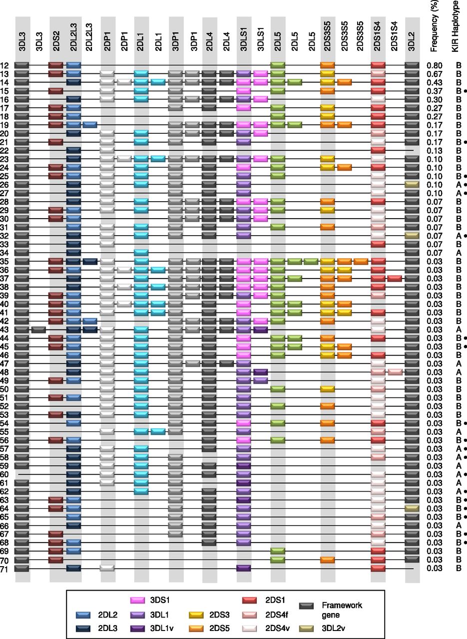 Unconventional KIR haplotypes and their frequencies. Fifteen altered A haplotypes and 56 B haplotypes all with frequencies <1%. Duplicated genes are not depicted in order, but for simplicity, the paralog has been arbitrarily placed adjacent to the ancestral gene. In some cases, the order of all of the genes has not been determined. Genes suffixed with “v” have parts altered or deleted including fused genes resulting from NAHR or a novel allele. 2DS4v represents the 22-bp frameshift deletion variant, and 2DS4f is the full-length form. 3DL1v on haplotypes 63 and 48 tested negative for exon 4 and on haplotypes 59, 61, 71, and 43 negative for exon 9. 3DL2v on haplotypes 64 and 26 were negative for exon 4 and on haplotype 32 negative for exon 9. Nineteen haplotypes, marked with a black dot, were missing a copy or part of a single locus but otherwise could be the same as standard haplotypes (common arrangements of genes). Apart from haplotypes 15 and 21, which carried a hybrid gene (2DS2/2DS3; 2DS2*005), these marked haplotypes may not reflect true copy number variation because in these cases, we could not rule out the possibility that the gene was present but was erroneously scored as missing due to sequence variation that did not complement our generic primers (see Methods; Supplemental Material). To help resolve novel KIR haplotypes from unphased genotypes of unrelated individuals, we developed a tool for imputing haplotype pairs given observed copy number for each KIR loci. This tool is provided at http://www.bioinformatics.cimr.cam.ac.uk/haplotypes/.