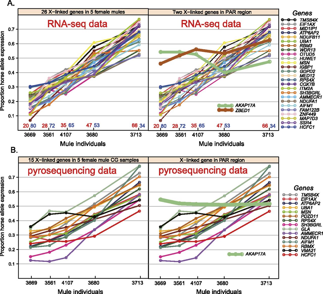 Plot of allelic expression proportions in five female mules for 28 X-linked genes in RNA-seq data and 16 X-linked genes in pyrosequencing verification data. (A, left) Allelic expression profiling of 26 X-linked genes in five female mules from the RNA-seq data. The x-axis simply arrays the five individuals. Plotted on the y-axis is the proportion of expression from the horse allele. Two genes (AKAP17A and ZBED1) in the pseudoautosomal region are highlighted in the right panel. (B, left) Allelic expression profiling of 15 selected X-linked genes in five female mules from pyrosequencing verification. The x-axis arrays the five individuals as in panel A. Plotted on the y-axis is the proportion of expression from the horse allele. The PAR gene AKAP17A is highlighted in the right panel.