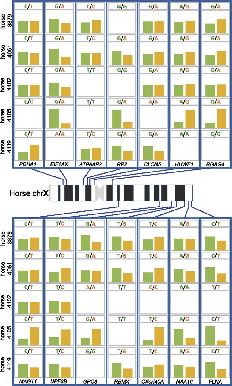Pyrosequencing results for 14 X-linked genes in female horse chorionic girdle trophoblast samples. Plotted are allele-specific expression percentages in horse day 33 chorionic girdle samples quantified by pyrosequencing in five female horse samples. (Green) Horse reference allele; (orange) alternative allele. Uninformative homozygous loci are not shown. We observed variable biallelic expression for all 14 genes rather than preferential maternal expression, suggesting random X inactivation in horse placenta. Within genes, we also observed the cis-eQTL effect (EIF1AX, RGAG4, RBMX, and FLNA). The horse X chromosome ideogram was drawn from the work by Bowling et al. (1997).