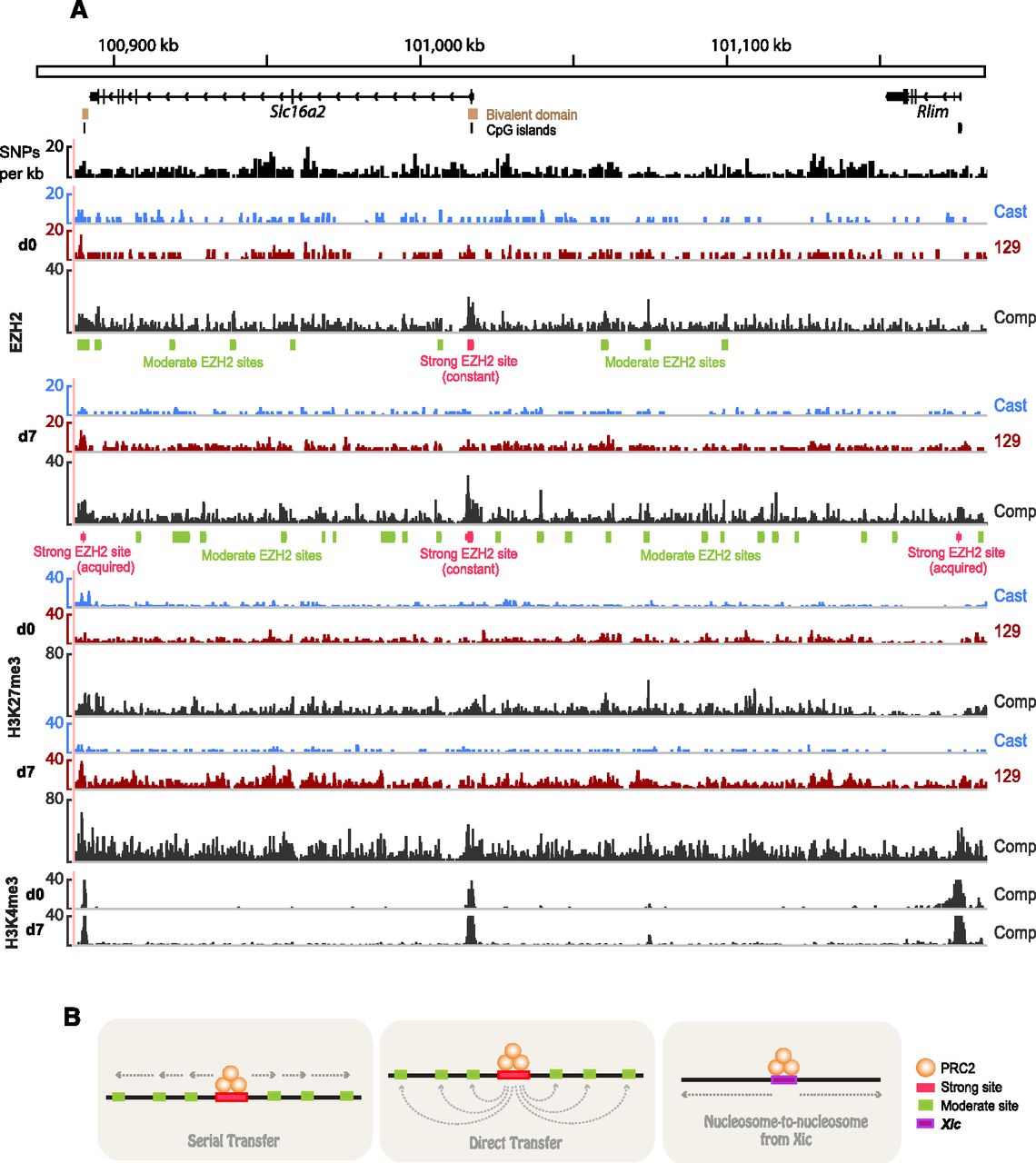 Developmental profile of the Slc16a2-Rlim region. (A) Composite (comp) and allelic (Cast, 129) ES d0 and d7 profiles, showing strong and moderate EZH2 sites across the Slc16a2-Rlim region. SNP and Indel density per 1-kb window, CpG islands and bivalent domains are shown above the epitope tracks. (B) Three potential models for spreading of EZH2.