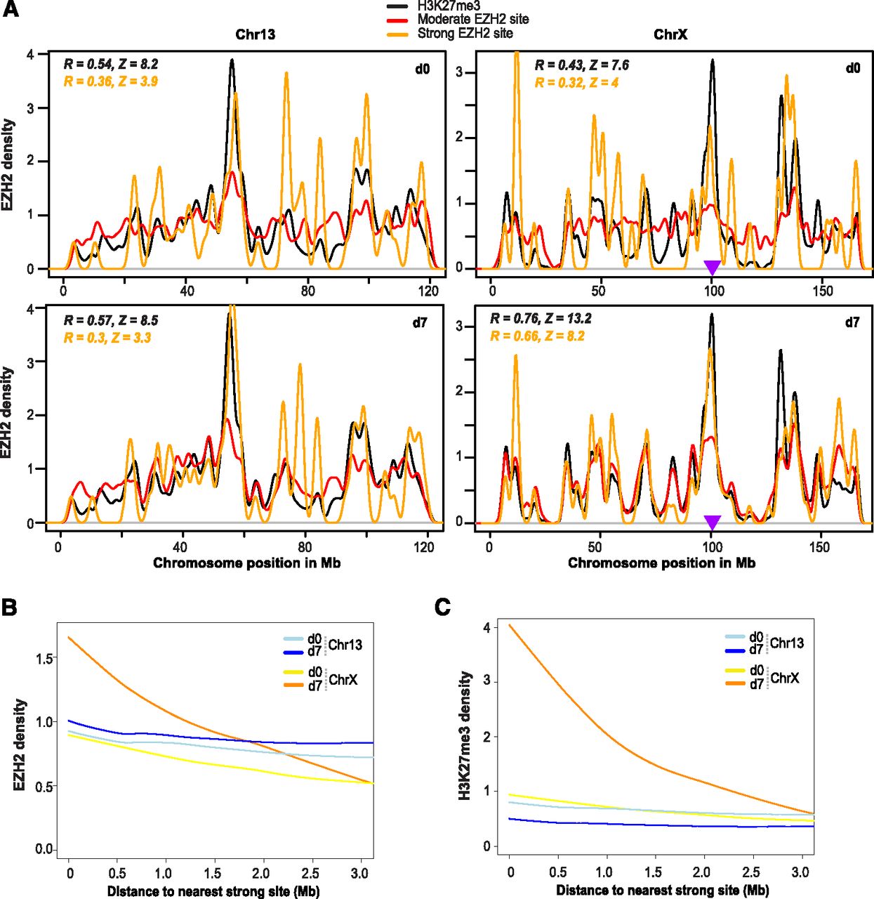 Spread of H3K27me3 from EZH2 sites occurs in a distance-dependent manner. (A) EZH2 and H3K27me3 densities from d0 and d7 were binned over Chr13 and ChrX positions to obtain correlation coefficients and Z scores from a permutation-based random model. Pearson R coefficients are indicated for the correlation of strong/moderate EZH2 sites (orange values) and H3K27me3/moderate EZH2 sites (black values). A purple triangle marks the location of the Xic. (B,C) Smoothed trend lines of EZH2 (B) or H3K27me3 (C) densities at a given distance from the nearest strong site, on indicated days and chromosomes. Densities are plotted over a sliding 1-kb window with steps of 200 bp.