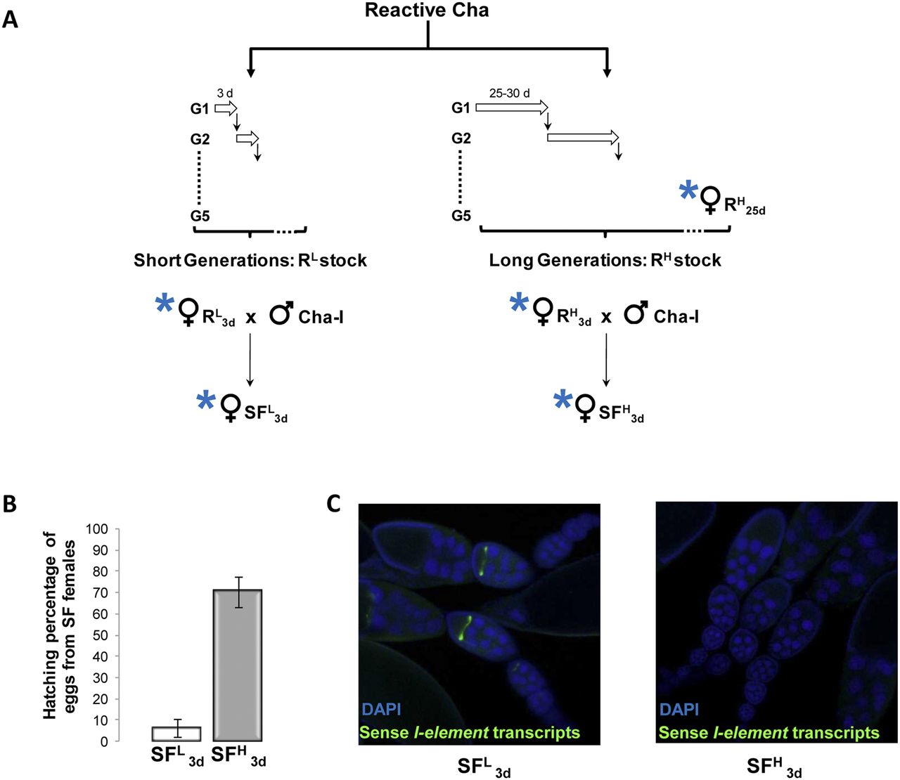 The rescue of SF sterility induced by aging treatment of the maternal ancestors correlates with I-element repression. (A) Schematic representation of the biological model. The reactive (R) Cha strain was divided into two stocks and bred during at least five successive short or long generations to produce isogenic RL and RH stocks, respectively. Short and long open arrows correspond to the age of the egg-laying females (3-d-old and 25- to 30-d-old, respectively) used to produce the subsequent generation. Three-day-old females from both stocks were crossed with Cha-I inducer males to generate SFL and SFH females. The blue asterisks highlight flies the ovaries and eggs of which were used to perform small RNA sequencing. (3d) 3-d-old females; (25-30d) 25- to 30-d-old females. (B) Histogram showing the hatching percentage of eggs from SFL3d (white) and SFH3d (gray) females (bars, mean ± SD; Wilcoxon signed-rank test P = 10−12, n = 33 vials). (C) RNA FISH on whole-mount preparations of ovaries from SFL3d (left panel) and SFH3d flies (right panel) using a FITC-conjugated antibody against a biotin-labeled antisense riboprobe specific for I-element sense transcripts. I-element sense transcripts were detected (green) only in oocytes of SFL ovaries. Ovaries were counterstained with DAPI (blue).