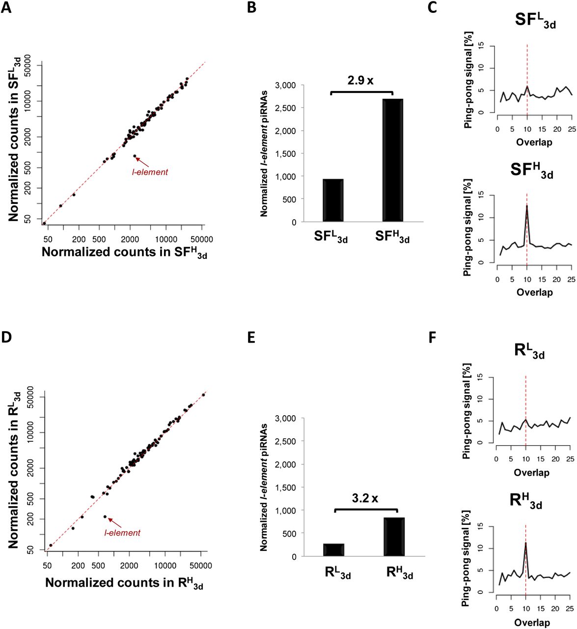 Aging treatment boosts the production of I-element piRNAs in the next generations. (A,D) Pairwise comparison of the TE piRNA levels in ovaries from 3-d-old isogenic flies (SFL3d, SFH3d and RL3d, RH3d) that have young or aged ancestors, respectively. Scatter plots display correlation between normalized piRNA abundances for each of the 85 most highly targeted Drosophila TEs (up to four mismatches allowed between reads and RepBase sequence). (B,E) Normalized counts of ovarian I-element piRNAs shows that they are increased in the offspring of females with aged ancestors. (C,F) A ping-pong signature for the I-element could only be detected in the progeny of aged ancestors.