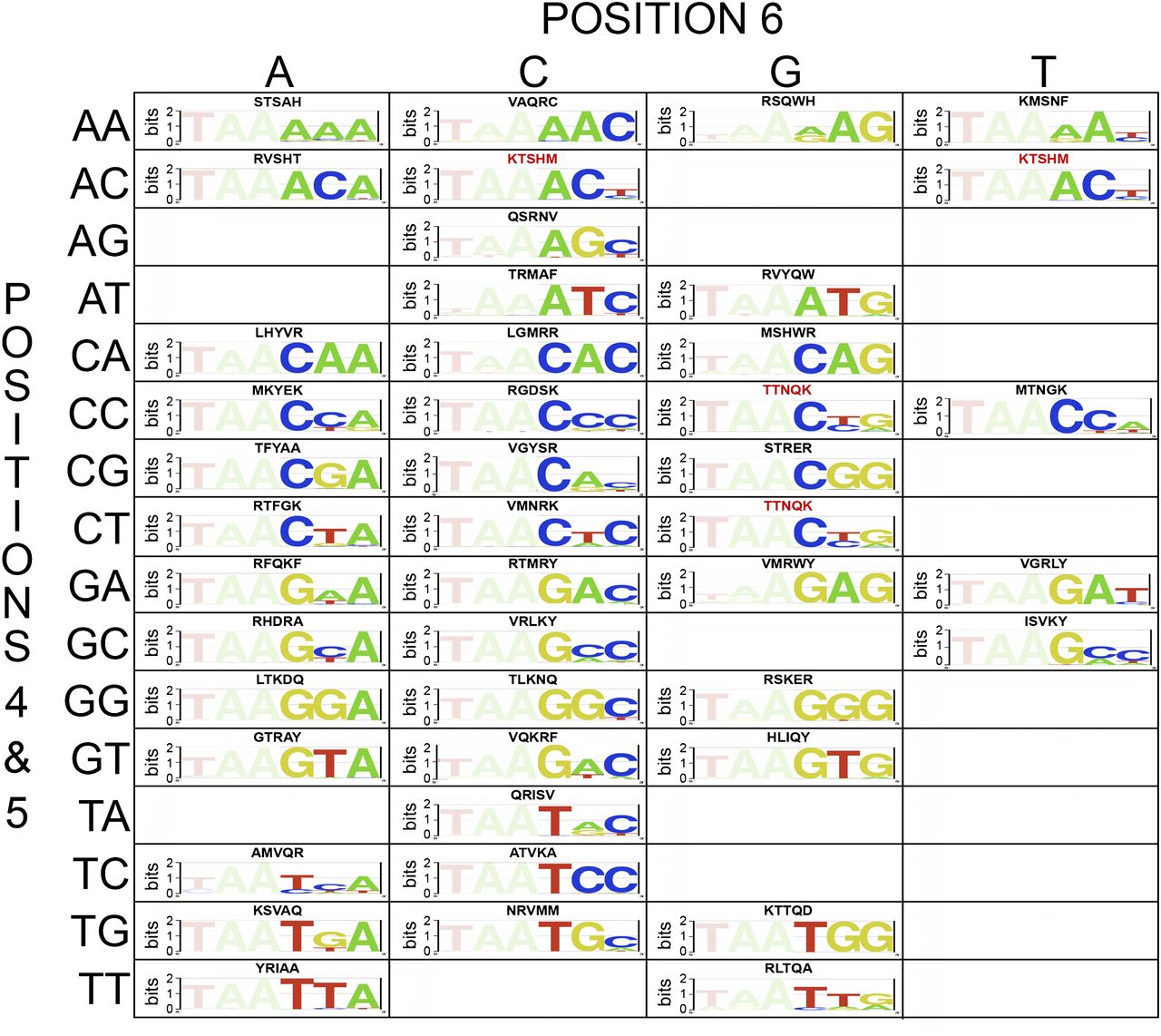 Selected HDs with favorable recognition preferences for each target site. A grid illustrating the selected HD variants that preferentially recognize or are compatible with particular 3′ binding site sequences. The amino acids that are present at the randomized recognition positions (43, 46, 47, 50, and 54) are indicated above each motif. Sequences in red indicate those that are present in more than one grid position (i.e., are compatible with two different sites). Empty boxes indicate the absence of quality HD recognizing these sequences.