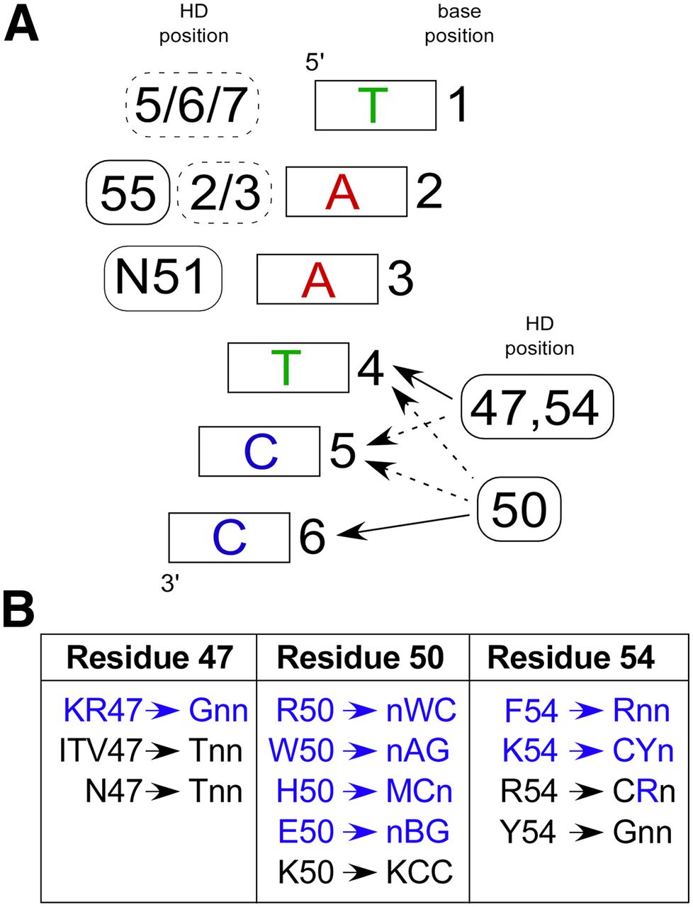 Robust specificity determinants observed in the selected HDs. (A) Canonical recognition pattern for HD–DNA interaction. At the 5′ end of the binding site (bases 1, 2, and 3), positions on the recognition helix (solid boxes) and the N-terminal arm (dashed boxes) contribute to specificity, where the position(s) of the contributing determinants are indicated to the left of the base pair. At the 3′ end of the binding site (bases 4, 5, and 6), homeodomain specificity is primarily defined by positions 47, 50, and 54, where these determinants have overlapping regions of influence. (Solid arrows) Primary positions of interaction; (dotted arrows) secondary influences on specificity. (B) New specificity determinants (blue) and previously described specificity determinants (black) for HDs containing the conserved N51 are broken down by position and trends in base preference within the 3 bp at the 3′ end of the target site. Note that there are exceptions within our characterized HDs to these specificity preferences, likely reflecting the overlapping influence of these determinants.
