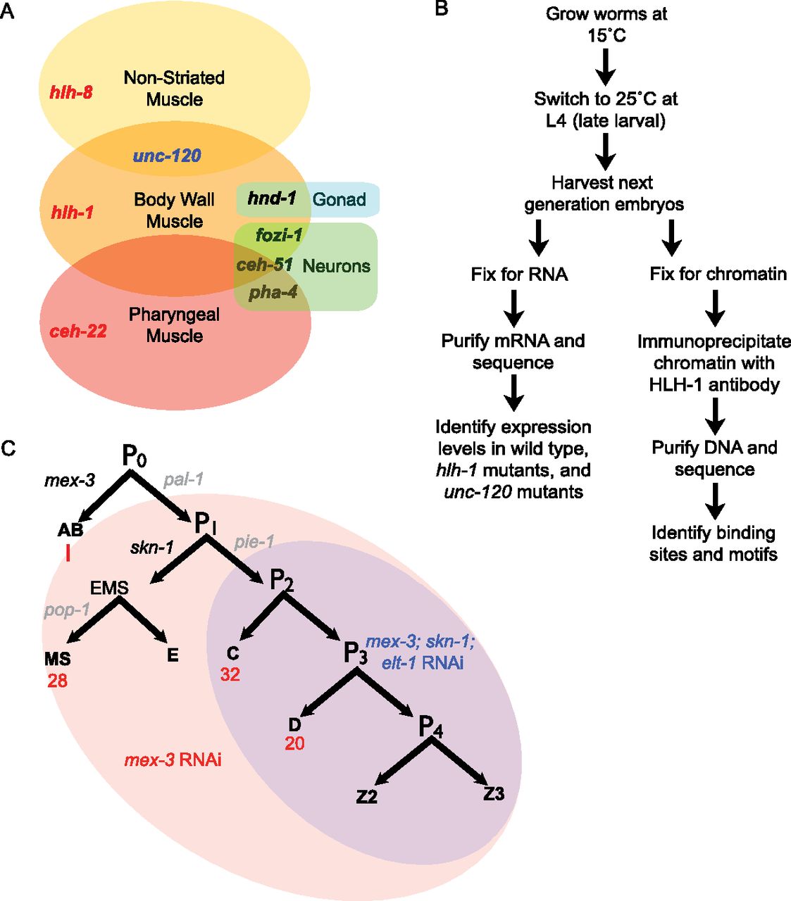 Experimental flow and muscle differentiation network. (A) The three types of nematode muscle and their associated transcription factors. (B) The experiments performed across three RNAi conditions (mex-3; skn-1; elt-1 RNAi, mex-3 RNAi, and no RNAi) in N2, hlh-1(cc561), and unc-120(st364). (C) The embryonic development lineages with BWM cell number in normal embryos (red) are highlighted to show which lineages are enhanced under the RNAi conditions (mex-3 RNAi and mex-3; skn-1; elt-1 RNAi).