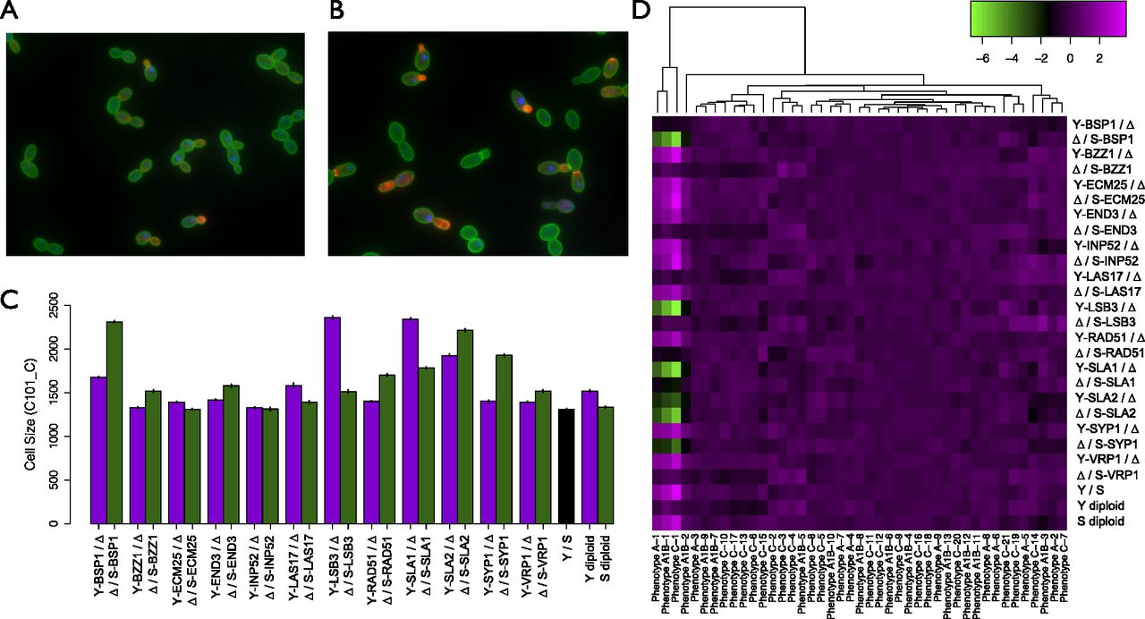 Pleiotropic effects on morphology. (A,B) Representative micrographs from a hemizygous deletion pair, LSB3 Δy/S (A), and LSB3 Y/Δs (B). Cells are stained with FITC- concanavalin A (green), Alexa Fluor 594 phalloidin (red), and DAPI (blue). (C) Barplot of a single morphological trait, cell size of budded yeast with two nuclei (C101_C), for all RH strain pairs. Error bars, ±1 SE. The work by Ohya et al. (2005) contains a full list of phenotypes and their descriptions. (D) Heatmap of hierarchically clustered nonredundant morphological phenotypes for all RH pairs. Phenotypes are the top principal components of 220 quantitative morphological traits of unbudded (A), budded with one nucleus (A1B), and budded with two nuclei (C) cells. The three leftmost phenotypes primarily correspond to cell size of yeast from each of the three cell types (A, A1B, and C).
