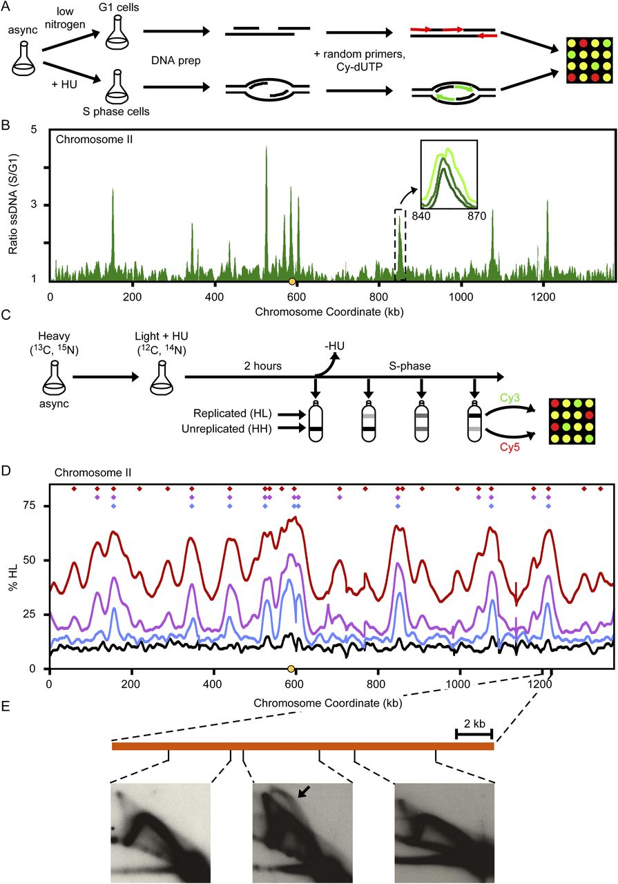 The ssDNA and density transfer assays. (A) Outline of ssDNA-based mapping of early-firing origins. L. waltii cells were treated with HU (200 mM) to enrich for ssDNA around origins of replication, or with low nitrogen medium to maintain cells in G1. ssDNA regions were labeled by random primed labeling without template denaturation and hybridized to a microarray. (B) The ratio of ssDNA in S/G1 is plotted for chromosome II. Early-firing origins are revealed as peaks in the plot. (Inset) Broadening in ssDNA peaks as S phase progresses. Plots for all chromosomes are shown in Supplemental Figure S2. (C) Outline of density transfer experiment to monitor replication dynamics. L. waltii cells were pregrown in a heavy isotope medium and then transferred to a light isotope medium containing HU (100 mM). After 2 h, HU was removed and cells were collected over the course of the S phase. DNA isolated from these samples were fragmented and subjected to ultracentrifugation to separate the heavy-heavy (HH), unreplicated DNA from the heavy-light (HL), replicated DNA. The HH and HL DNAs for each sample were labeled and competitively hybridized on a microarray. (D) Replication of chromosome II as revealed by the density transfer. The different colored lines correspond to samples taken at different times in the S phase: black (arrest), blue (15% HL), purple (25% HL), red (45% HL). The centromere is shown by a yellow circle on the x-axis. Color-coded diamonds above the plots indicate locations and samples in which origin activity (peaks of HL DNA) was detected. Plots for all chromosomes are shown in Supplemental Figure S3. (E) 2D gel analysis across a representative HL DNA peak confirms that the peak contains an origin.