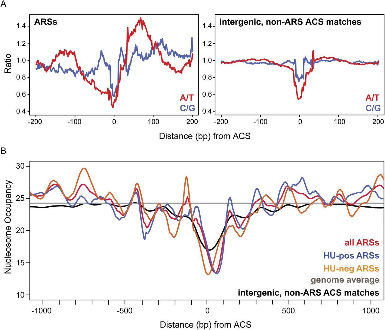 A-T asymmetry and the nucleosome profile surrounding the L. waltii ACS. (A) The ratios of A/T and C/G bases around the L. waltii ACS are shown. All sequences were plotted such that the ACS begins at position 0 and are oriented such that the T-rich ACS strand is plotted. (Left plot) ACSs present in ARSs; (right plot) ACS matches found in intergenic, non-ARS locations. (B) The nucleosome profile surrounding the L. waltii ACS is shown. All nucleosome data are orientated as in A. The colored lines show the nucleosome profile: red, all ARSs; blue, HU-pos ARSs; orange, HU-neg ARSs; black, intergenic non-ARS ACS matches; gray, genome-wide average.