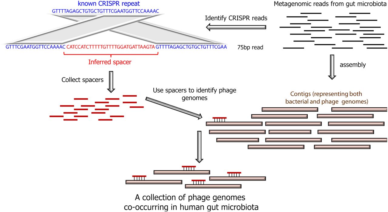 CRISPR spacers are used as probes to fish out phage genomes. In the MetaHIT metagenomics study (Qin et al. 2010), gut microbes were harvested from feces of 124 individuals, and DNA was sequenced to generate short reads (75 bp). These reads were then assembled into contigs, which mainly represent DNA of gut-residing bacteria, but potentially also contain DNA of phages associated with these bacteria. In the present study, CRISPR spacers were detected by searching for reads that match a known CRISPR repeat on both sides of the read. The spacers detected were then used to probe assembled contigs, and phage and mobile element contigs were identified as those showing high sequence identity with a spacer (but not with the CRISPR repeat).