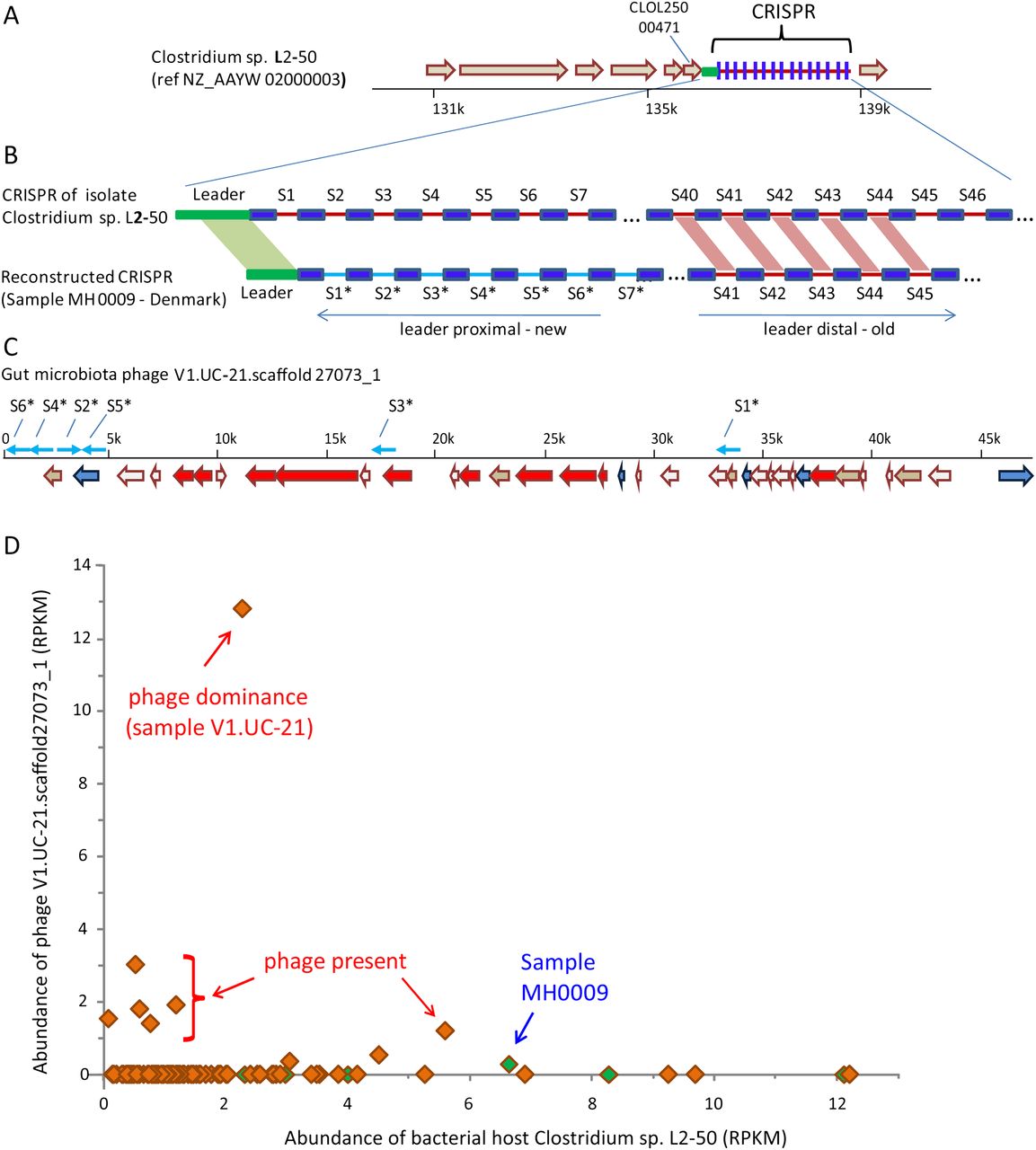 Phage/host infection and resistance interactions. (A) The CRISPR region in the isolate gut bacterium Clostridium sp. L2-50, which was sequenced as part of the Human Microbiome Project (HMP) (Turnbaugh et al. 2007). Shown is a 10-kb region from the draft assembled genome. (Block arrows) Annotated genes. (B) A CRISPR array reconstructed from metagenomic sequence reads of sample MH0009 partially matches the Clostridium sp. L2-50 array. (Dark blue boxes) CRISPR repeats; (red and cyan lines) spacers. Spacers are numbered according to their position in the array relative to the leader sequence. Spacers show identity in sequence and in order at the leader-distal region (“old” spacers), while leader-proximal spacers (newly acquired) differ between the arrays. (C) Contig V1.UC-21.scaffold27073_1 was identified as a phage in this study, because it is hit by multiple spacers. (Block arrows) Genes with colors denoting function; (red) phage-specific genes; (blue) DNA replication genes; (white) genes of unknown function; (brown) genes of other functions. (Cyan arrows) Positions where spacers from the reconstructed array in panel B show identity with the phage sequence (spacer hits not drawn to scale). All drawn spacers fully match or have one mismatch with the phage sequence. (D) Abundance of bacterial host versus phage in MetaHIT samples. X- and y-axes represent abundance of the bacterial host and phage, respectively, measured in RPKM. Each data point represents a European individual sampled as part of the MetaHIT gut microbiota project (Qin et al. 2010). Green-filled samples are those in which our analysis found a spacer that matched the phage sequence. Sample MH0009, in which the CRISPR array in panel B was reconstructed, is identified.