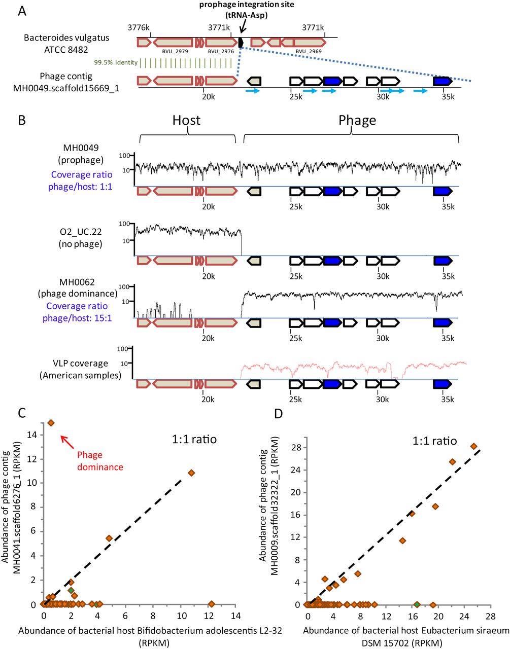 Lysogenic lifestyles of gut microbiota phages. (A) The 5′ end of phage contig MH0049.scaffold15669_1, which was assembled in sample MH0049 (Danish individual), has a 99.5% identity in the sequenced genome of Bacteroides vulgatus ATCC 8482. (Block arrows) Genes; (cyan-colored arrows) spacers matching the phage contig. (B) Coverage of phage contig MH0049.scaffold15669_1 by MetaHIT metagenomic reads from three samples. (X-axis) Position on phage contig; (y-axis) read coverage (log scale). (Red curve) Coverage of VLP reads from Reyes et al. (2010). (C,D) Abundance of phages MH0041.scaffold6276_1 and MH0009.scaffold32322_1 and their respective bacterial hosts in MetaHIT samples, indicative of lysogeny as a preferred lifestyle. The x- and y-axes represent abundance of host and phage, respectively. Each data point represents a European individual sampled as part of the MetaHIT gut microbiota project (Qin et al. 2010). Green-colored samples are the ones in which a spacer matched the phage sequence. “Phage dominance” indicates samples where the phage is suspected to have become active. The correlation coefficient of phage and host abundances for samples where both existed is 0.4 and 0.98, respectively.