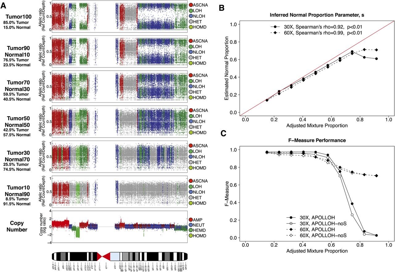 Tumor-normal sampling admixture experiment. Nine mixture proportions generated by sampling reads from the tumor and normal BAM files were analyzed (see Methods). (A) APOLLOH results are shown for chromosome 9 of mixture proportions of 0.09, 0.26, 0.43, 0.60, and 0.77 tumor reads sampled to 30×. (Tumour100) Results from the original tumor sample. (B) The normal proportion parameter s inferred by APOLLOH was significantly correlated (Spearman's rho = 0.92) with the mixture proportions of 0.1–1.0 (increments of 0.1) at 30× and 60×. (C) The F-Measure performance of APOLLOH and APOLLOH-noS (not accounting for normal contamination) for 30× and 60× admixtures was evaluated using Affymetrix SNP6.0 data as ground truth.
