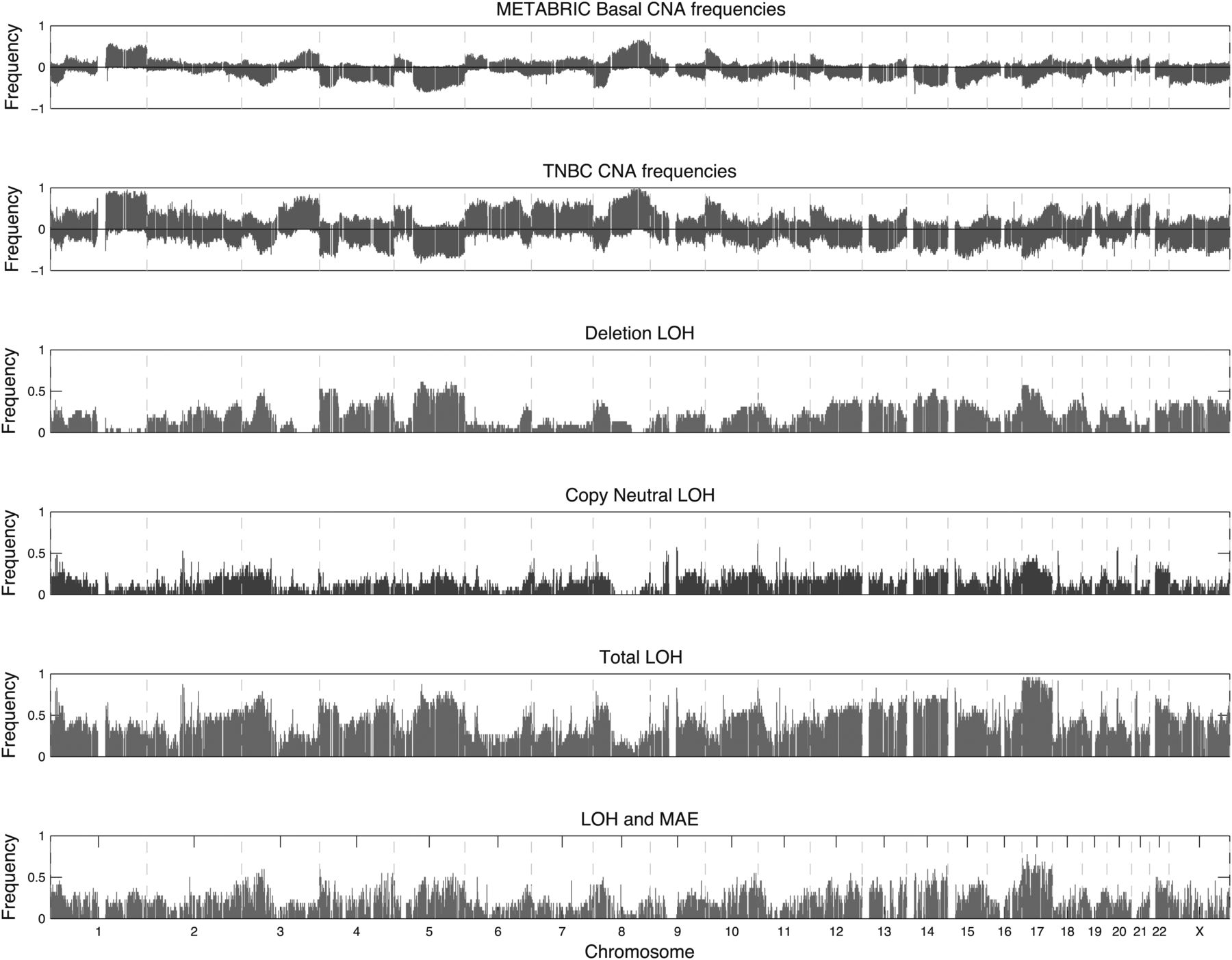Genome-wide gene frequencies of APOLLOH predictions, copy number profiles from the current 23 cases, and an external (METABRIC) data set (Curtis et al. 2012), and monoallelic expression. From top to bottom, the first and second panels show copy number profiles for cohorts of 118 basal-like subtype breast cancer patients from METABRIC, analyzed on Affymetrix SNP6.0 arrays, and the 23 TNBC patients. Deletion gene frequency profiles (negated for display purposes) in both data sets show similar patterns to deletion LOH frequencies shown in the third panel. The fourth and fifth panels, respectively, show the profile of genes affected by copy neutral LOH and the profile of overall LOH events including genes found within deletions, copy neutral regions, and amplifications. The last panel shows the frequency profile of genes that are observed with monoallelic expression (MAE) as a consequence of genomic LOH events for 22 samples with available RNA-seq data.