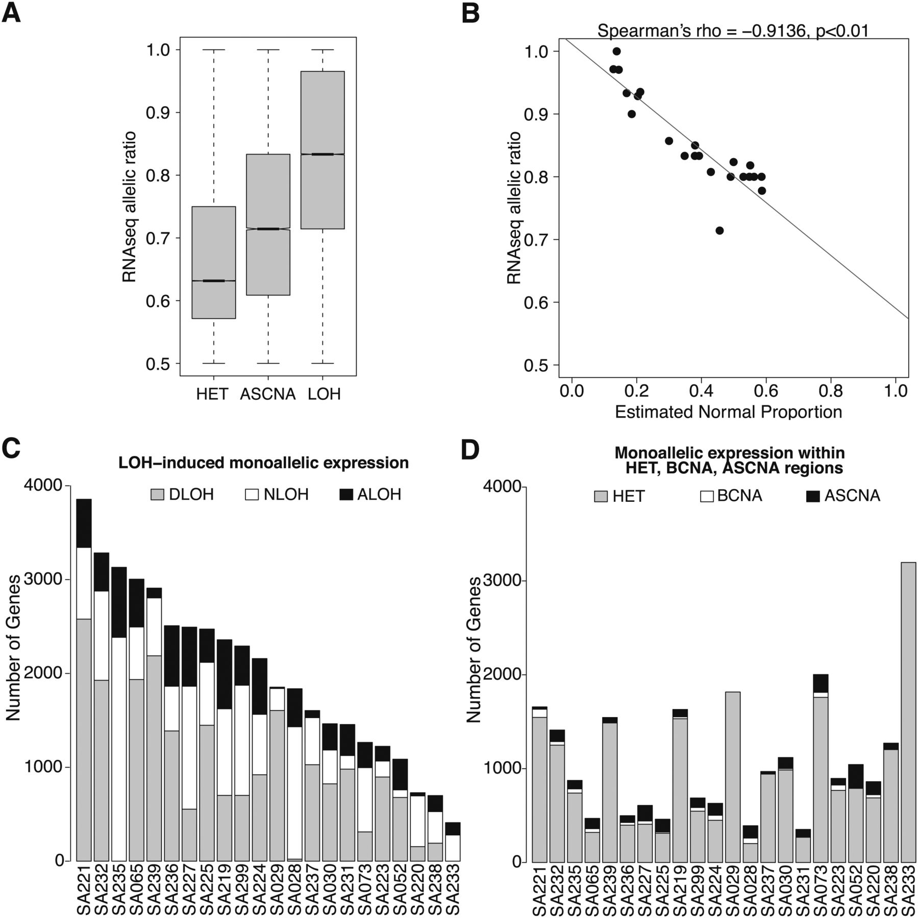 Integrative analysis of APOLLOH results and transcriptome RNA-seq expression. (A) The distribution of transcriptome RNA-seq symmetric allelic ratios that fall within HET, ASCNA, and LOH predicted regions are significantly different (pairwise Wilcoxon one-tailed test, p < 0.01). (B) The median symmetric allelic ratio of RNA-seq data within predicted LOH segments for each sample, represented as a point, strongly negatively correlated (Spearman's rho = −0.91) with estimated normal proportion parameter s (first principal component line is shown). (C,D) Distribution of the number of monoallelic expressed genes within genomic loss-of-heterozygosity (LOH), heterozygous (HET), and allele-specific copy number amplification (ASCNA) regions in 23 breast cancer samples. (C) The number of MAE genes established by LOH events are categorized into deletion (DLOH), copy neutral (NLOH), and amplification (ALOH) and sorted by total LOH in descending order. (D) The number of genes with MAE that overlapped genomic HET, balanced CNA (BCNA), and ASCNA regions are shown in same sorted order as in C.