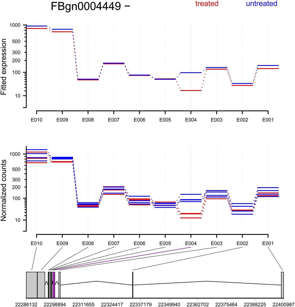 The treatment of knocking down the splicing factor pasilla affects the fourth exon (counting bin E004) of the gene Ten-m (CG5723). (Top panel) Fitted values according to the linear model; (middle panel) normalized counts for each sample; (bottom panel) flattened gene model. (Red) Data for knockdown samples; (blue) control.