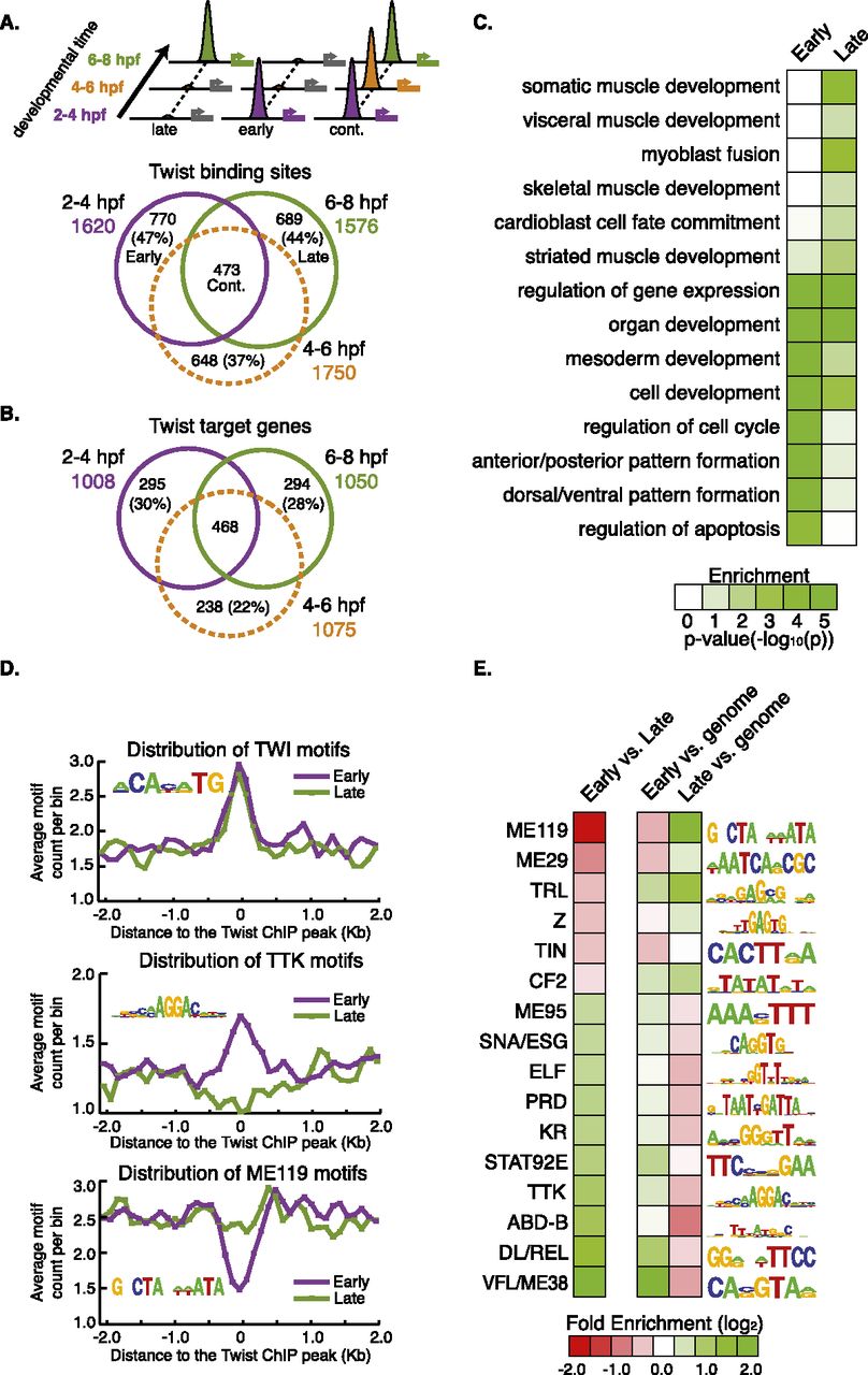 Context-specific Twist binding sites display differential motif content. (A) Twist binding sites identified by ChIP-chip in D. melanogaster embryos (Zinzen et al. 2009) differ between developmental time points (2–4, 4–6, and 6–8 hpf). The ‘early,’ ‘late,’ and ‘continuous’ classes of binding sites are indicated and comprise sites to which Twist binds exclusively at 2–4 (early), 6–8 hpf (late), or at all three time points (cont.). (B) The genes close to the Twist binding sites also differ between time points. (C) Genes close to the early and late binding sites are enriched in different Gene Ontology (GO) categories, as expected for respective developmental stages. Shown are hypergeometric P-values (see color legend) for selected categories that are significant for at least one time point (see Supplemental Table S2 for all categories and the GO identifiers). (D) Distribution of the Twist (TWI), Tramtrack (TTK), and ME119 motifs according to their distances to the summits of all Twi ChIP-chip peaks of the ‘early’ (purple) and ‘late’ (green) time points (shown are motif counts for each 200-bp bin averaged across all ChIP-chip peaks for each time point). While the distribution of TWI motifs does not differ between early and late binding sites, the TTK motifs are enriched and the ME119 motifs are depleted in early sites. (E) Motifs are differentially enriched between the early and late binding sites, even when corrected for different overall sequence composition using shuffled controls motifs. (Left column) Shown are fold-enrichment values for the motifs that are differentially distributed between the early and late sites (P-value ≤ 0.05; motifs from Stark et al. 2007). Interestingly, the differential motif distribution between the early and late sites stems from consistent motif enrichment and depletion with respect to the average intergenic genome (right columns), as expected for motifs that help define TF binding sites within a large genome.