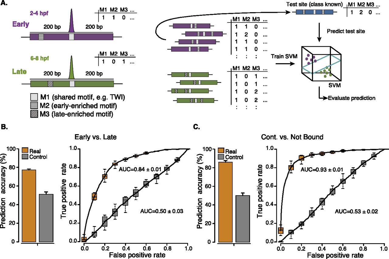 Cis-regulatory motif content predicts TF binding. (A) Schematic overview of the approach. To computationally classify context-specific TF binding sites based on their motif content, we counted all instances of known cis-regulatory motifs (denoted here as M1, M2, M3, etc.) in 401-nt-long windows centered on each ChIP-chip peak's summit (left; purple and green denote early and late bound sites, respectively). We used the motif counts (M1, M2, M3, etc.) for all binding sites as feature vectors for binary classification with a support vector machine (SVM) using leave-one-out cross-validation (LOOCV). Briefly, we excluded each binding site in turn for testing (blue), trained the SVM on the remaining sites, and predicted the test site (right). (B,C) Prediction (binary classification) of early versus late Twist binding sites (B) or continuously bound versus not bound Twist motifs (C) based solely on the motif content. (Orange) Prediction accuracies (percent of correctly classified sites; left) and receiver-operating-characteristic (ROC) curves (right; area under the curve [AUC] values are indicated). We repeated the entire procedure after randomizing the sites' class assignments (controls; gray), which yields random classifications (∼50%; AUC∼0.5) as expected (see Supplemental Discussion). The accuracy and AUC values for all other mesodermal TFs can be found in Supplemental Table S3; and for TFs, cofactors, and histone modifications in C. elegans, mouse, and human in Table 1.