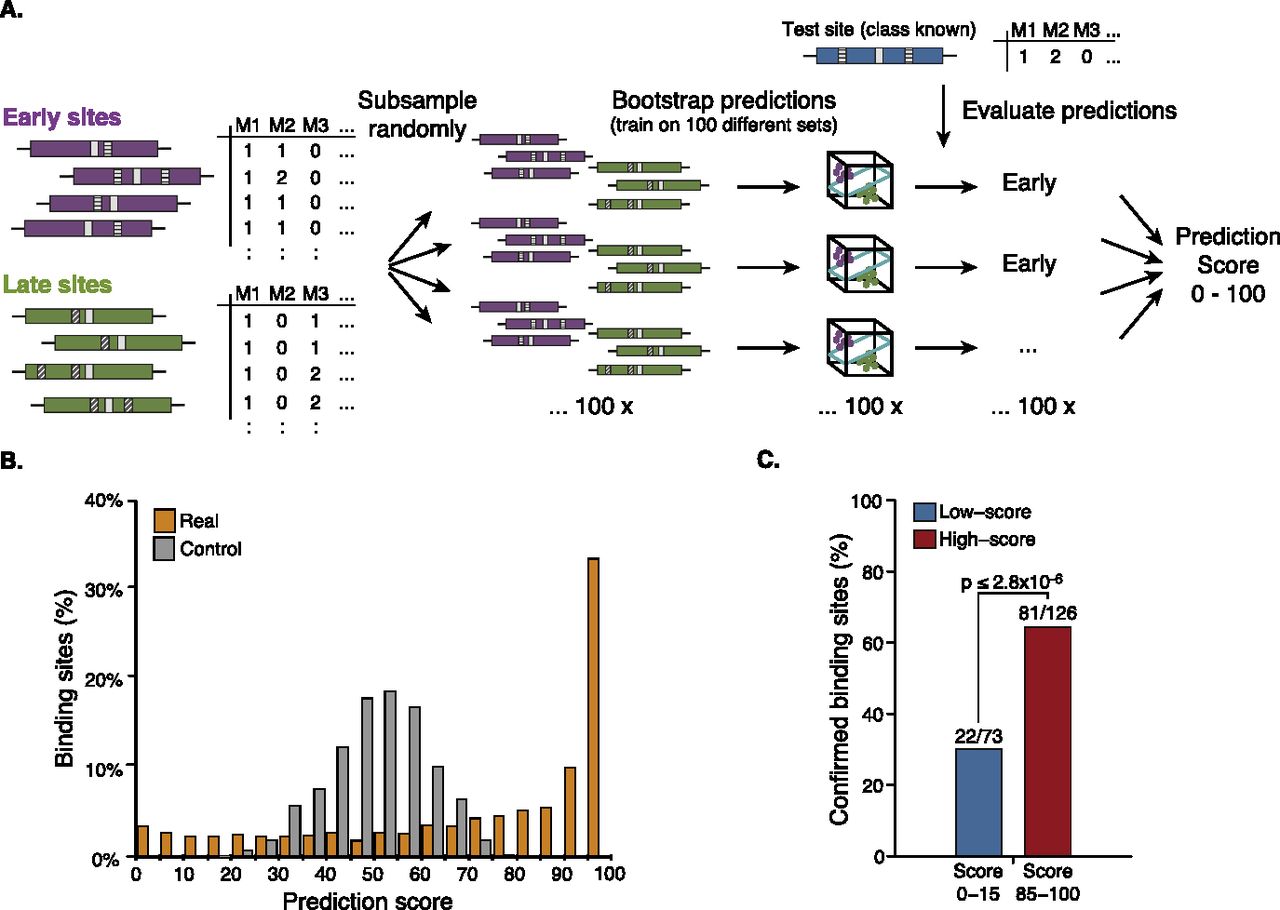 A prediction score for individual TF binding sites. (A) Schematic overview of the bootstrapping approach used to calculate a prediction score for each individual binding site. We excluded a site for testing (blue) and subsampled the remaining sites (left) 100 times to obtain 100 different training sets (middle), each of which we used to predict the test site (right) (see Fig. 2 for details). The prediction score represents the number of correct predictions and ranges from 0 to 100. (B) Distribution of the prediction scores for the classification of early versus late Twist binding sites (orange) and for controls for which we repeated the entire procedure after randomizing the sites' assignments to the early and late classes (gray). (C) Predictability of binding might be underestimated because sites with low prediction scores are less often reproducible by ChIP: Twist binding sites with high prediction scores (red; score-range 85–100) are significantly more often detected in an independent ChIP-seq data set (from He et al. 2011) than sites with low scores (blue; score range 0–15). Shown is the number of total and confirmed binding sites for sites in both score ranges and the binomial P-value.