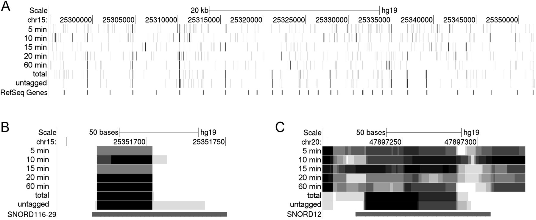 Processing of the SNORD116 cluster. (A) Read density for the SNORD116 cluster region (overview). (B) Read density plot for a typical snoRNA of the SNORD116 cluster only shows reads at the 5′ end of the mature snoRNA, but no intronic sequences, thus representing sequencing of the mature, unfragmented snoRNA. (C) Read density plot for a typical intronic snoRNA. Here, intronic sequences were observed until 60-min 4sU-RNA.