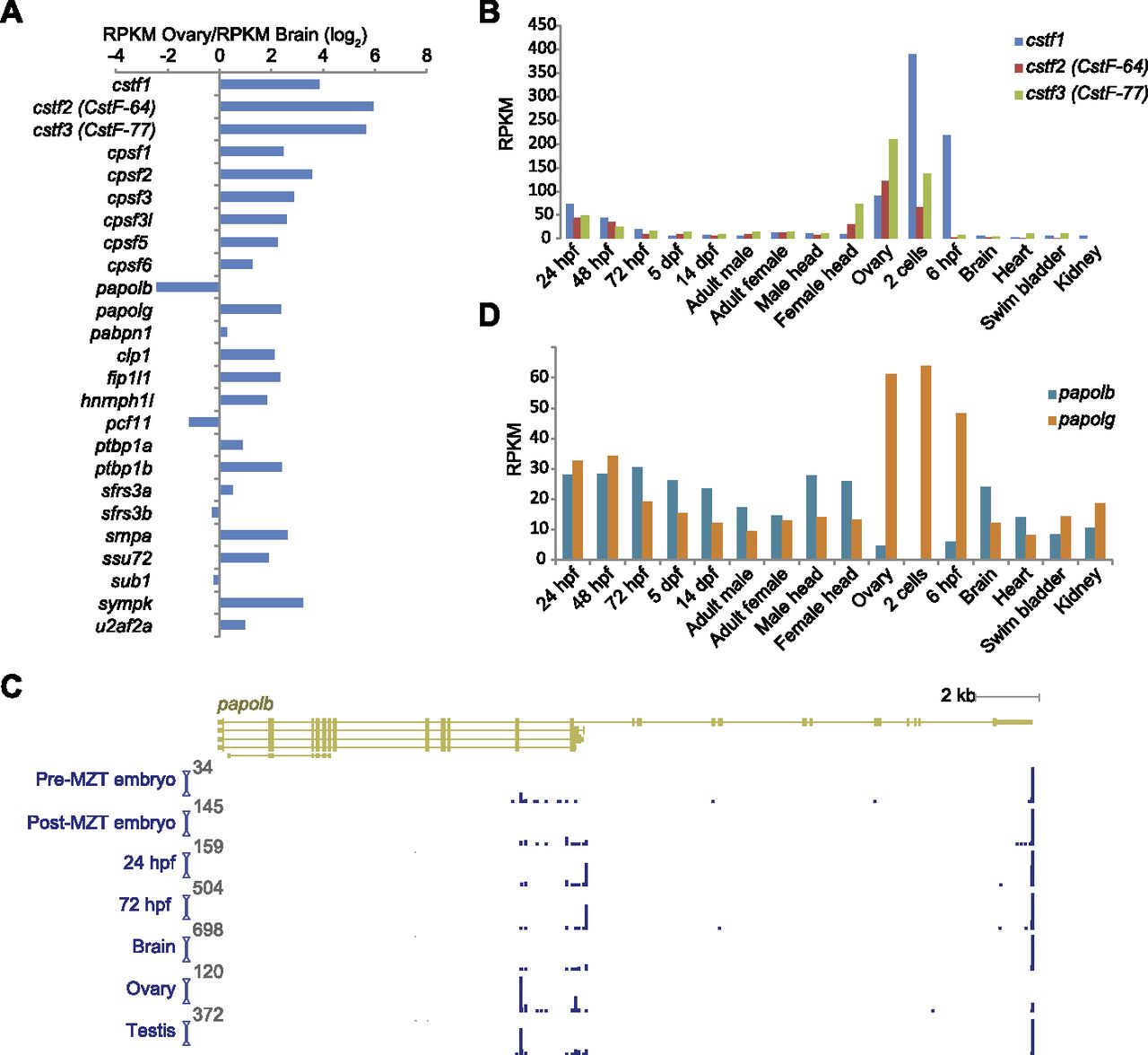 Changes in expression and polyadenylation of CPA factors during zebrafish development. (A) Relative expression of CPA-related genes (listed in Liu et al. 2007) in ovary and brain. Mammalian homologs of CstF factors are in parentheses. (B) Expression of mRNA for CstF factors in different stages and tissues. (C) Differential alternative polyadenylation of papolb. The transcript models shown are as annotated in Ensembl v66. The height of each plot indicates the number of 3P tags ending at each position, normalized to the maximum value, which is indicated at the top of each axis. (D) Expression of mRNA for poly(A) polymerases in different stages and tissues.