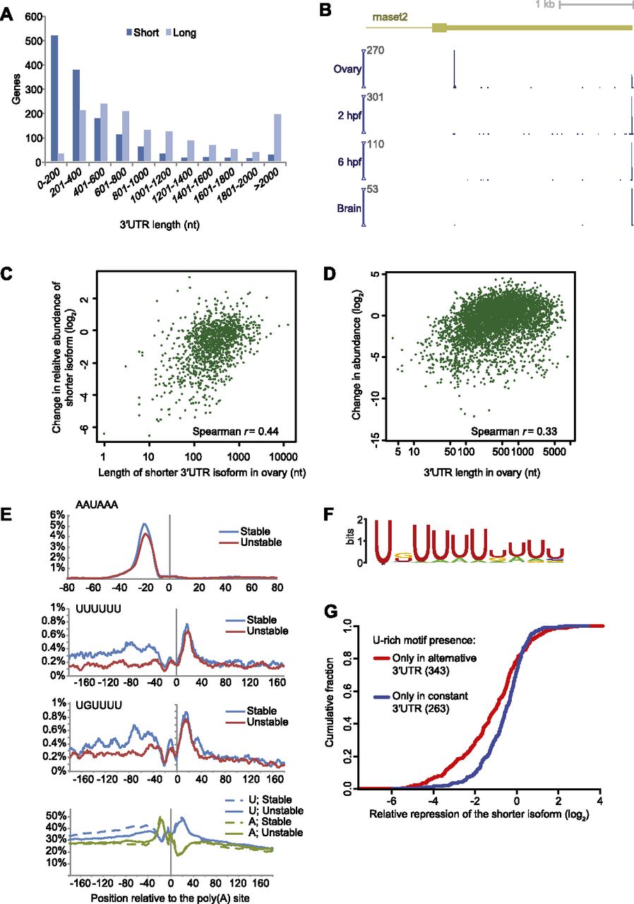 Differential accumulation of transcripts with short 3′ UTRs in the ovary and pre-MZT embryo. (A) Comparison of 3′ UTR lengths of the short and the long isoforms in genes with exactly two isoforms in the ovary. (B) Poly(A) sites of rnaset2 in the indicated samples. The shown 3′ UTR structure is as annotated in Ensembl v66. The height of each plot indicates the number of 3P tags ending at each position, normalized to the maximum value, which is indicated at the top of each axis. (C) Relationship between length of the shorter isoform and relative abundance of the shorter isoform in the pre-MZT embryo, as inferred from 3P tags for genes with two alternative poly(A) sites in the ovary. (D) Relationship between the length of the 3′ UTR in the ovary and the change in mRNA observed in the pre-MZT embryo relative to that in the ovary, as inferred by 3P tags. Analysis was for genes with a single 3′ UTR supported by at least 20 3P tags in the ovary. (E) Frequency of the indicated motifs or nucleotides flanking poly(A) sites of isoforms that were not reduced in the pre-MZT embryo compared to the ovary (stable) and those that were reduced at least twofold (unstable). For the hexamer motifs, the frequencies shown at each position are averages of a window of 11 consecutive nucleotides centered at that position. (F) The motif identified by Amadeus (Linhart et al. 2008) as significantly enriched in regions upstream of the stable sites. (G) Destabilization in the pre-MZT embryo of shorter isoforms lacking the U-rich motif. Genes with two UTR isoforms in the ovary and a U-rich motif 20–90 nt upstream of only one of the poly(A) sites were stratified based on the location of the motif—upstream of the distal site (red line) or upstream of the proximal site (blue line). A U-rich motif was defined as present if a decamer with up to two mismatches from the UK(U)8 consensus appeared 20–90 nt upstream of the poly(A) site.