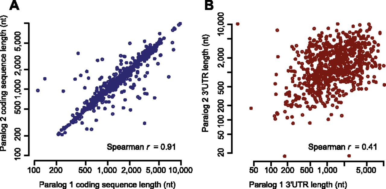 Analysis of paralogous gene pairs generated in the teleost whole-genome duplication. (A) Relationship of coding-sequence lengths for pairs of paralogous genes. Genes of each pair were arbitrarily assigned to each axis. (B) Relationship of 3′ UTR lengths for pairs of paralogous genes. 3′ UTR lengths are the weighted average across all the samples in which the transcript had at least one 3P tag.