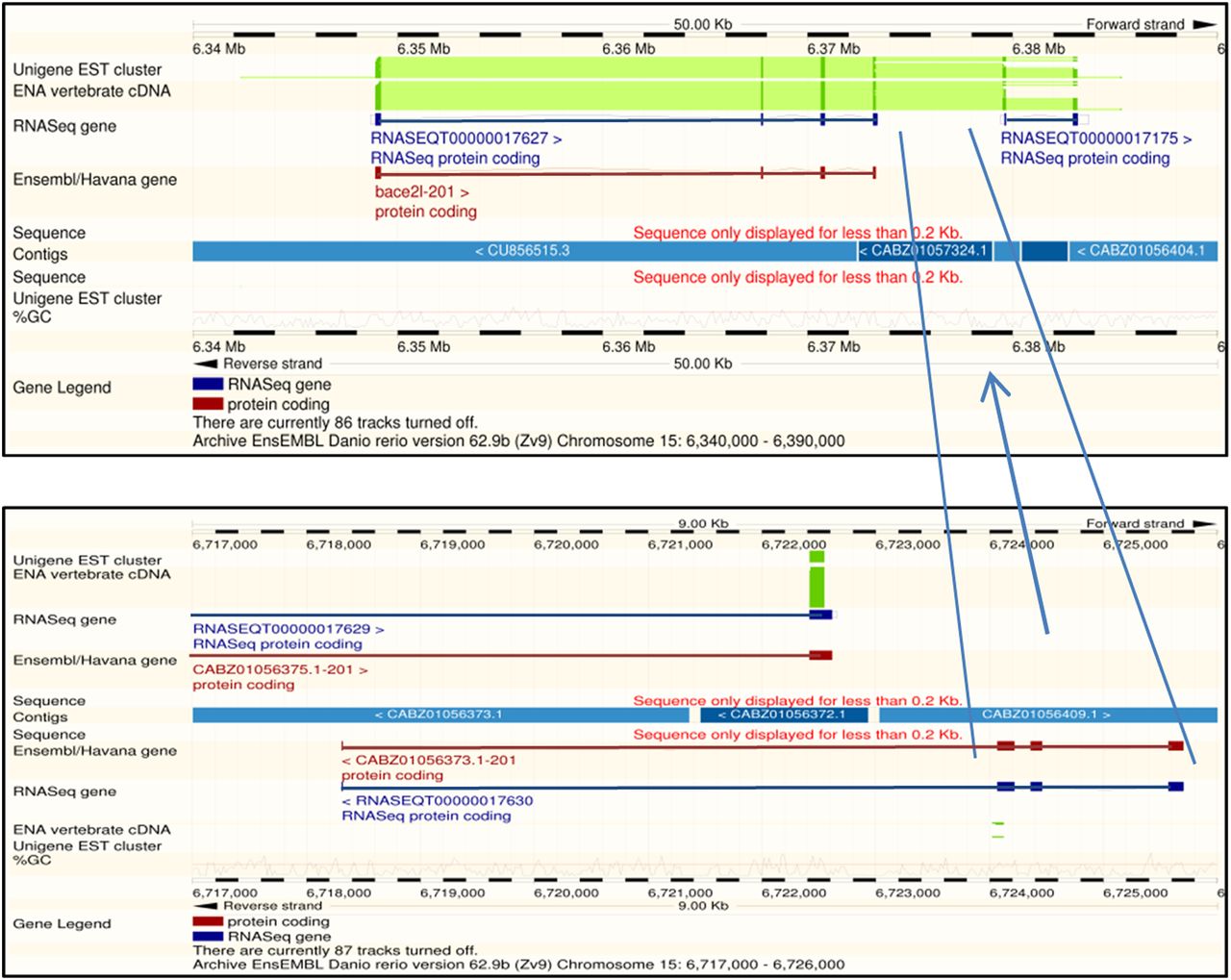 The Ensembl browsers from release 62 between 15: 6,348,671-6,373,413 shows the transcript ENSDART00000065824 for the gene bace2. This transcript was annotated from species-specific cDNAs BC164206.1, BC083415.1, and BC098874.1. Matching BC098874.1 to the Zv9 assembly using Ensembl suggests that the 5′ end matches four exons in the reference sequence as annotated in ENSDART00000065824, the central portion matches four exons over 340,000 bases away between 15:6,718,308 and 6,725,702, and the 3′ end matches two exons adjacent to the first four exons between 15:6,379,504 and 6,383,732 (note that the sequence of the short fourth exon of the central portion can be found at the 5′ end of the first exon of the final two exons and is probably an artifact of the read alignment process). This shuffled exon order suggests a reference sequence assembly problem. On closer inspection, apart from the first three exons, the transcript is aligned to capillary and Illumina whole-genome shotgun assemble rather than the more reliable genomic clone sequence. The underlining reference sequence of the central four exons appears to be incorrectly located on chromosome 15. The Ensembl genebuild has create the longest single transcript from the cDNA. Interestingly, the RNA-seq-only genebuild has a model in all three locations. The first four exons match RNASEQT00000017627, the middle three exons match RNASEQT00000017630 creating a partial additional gene, and the final two exons match RNASEQT00000017175. The RNA-seq genebuild is unable to join the first four exons to the last two exons because three exons and four introns are missing. This example demonstrates annotation problems associated with errors in the reference sequence. Expanding this principle to other species, the degree of disrupted transcripts will be related to the quality of the assembly. It also highlights how a break in transcript contiguity can be caused by incomplete exon or intron data that could arise, for example, from low read coverage.