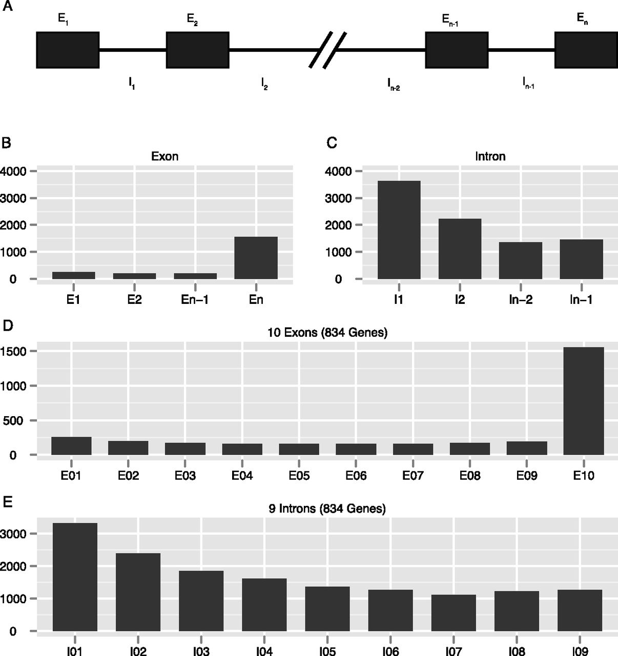 Lengths of exons and introns with respect to their relative positions in genes. (A) Labeling method for introns and exons used in the following panels. (B,C) Average length of exons and introns diagrammed in A. (D,E) Average length of each exon and intron in all genes containing 10 exons.