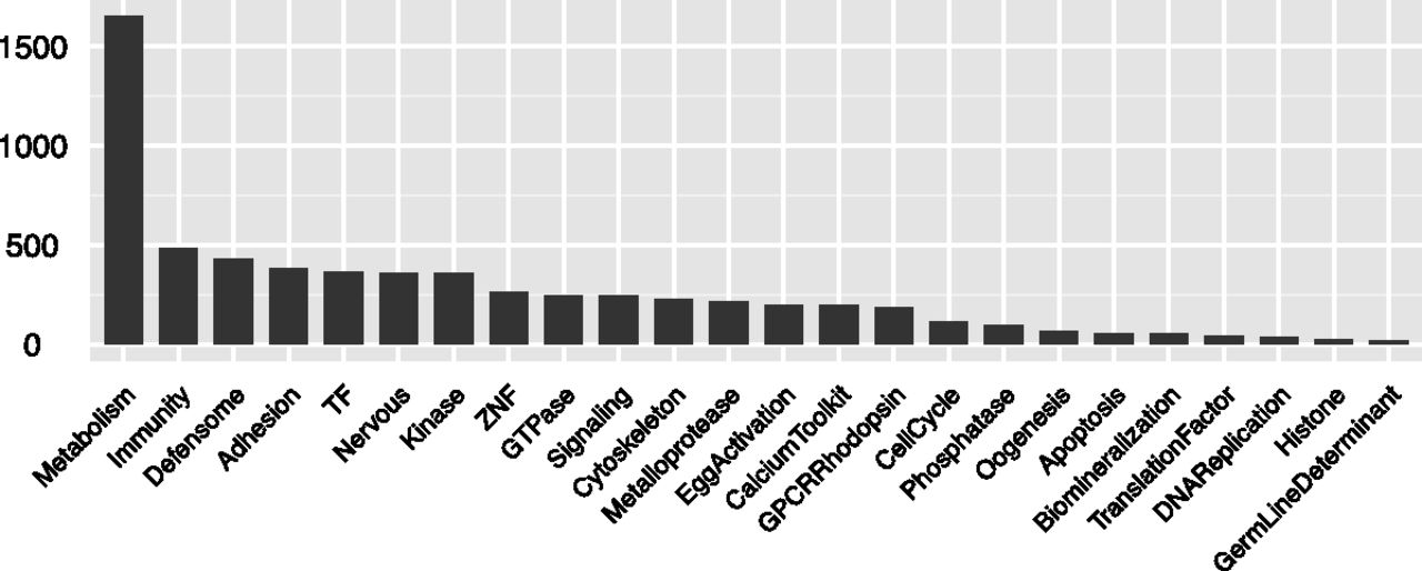 Numbers of gene models associated with major functional classes. The distribution is based on the custom sea urchin ontology discussed in the text.
