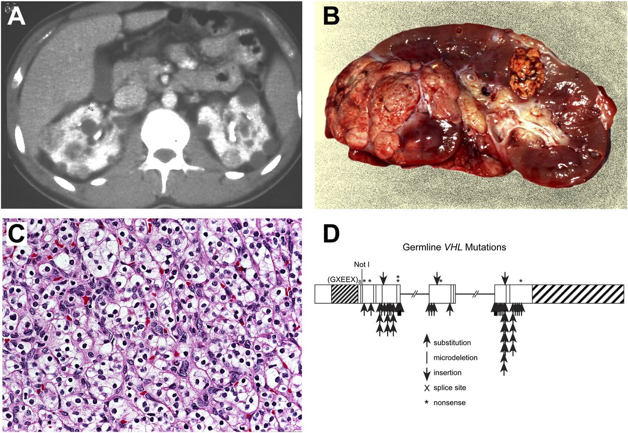 Clear cell kidney cancer. Von Hippel-Lindau (VHL) is an autosomal hereditary cancer disorder in which affected individuals are at risk for the development of bilateral, multifocal kidney cancer (A,B) of clear cell histologic type (C). VHL is characterized by germline mutation of the VHL gene (D). The VHL gene is mutated in 57%–89% of sporadic, noninherited clear cell kidney cancers (Gnarra et al. 1994; Moore et al. 2011). (Fig. 2 from Linehan et al. 2003.)