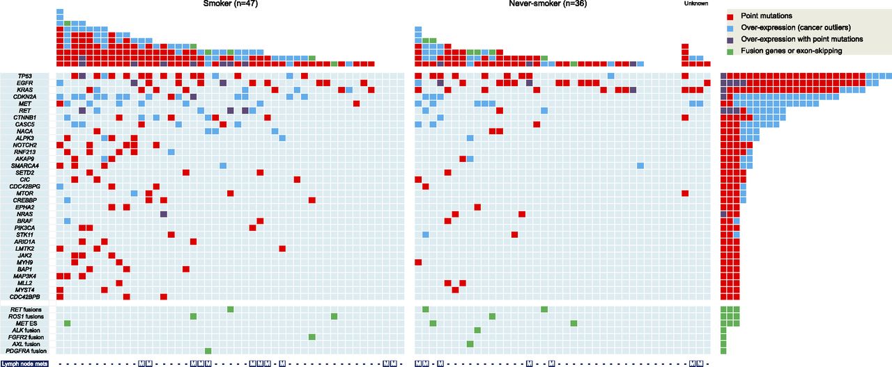 The transcriptional landscape and mutational profile of 87 lung adenocarcinomas. Each column characterizes the signature of cancer in one patient. Patients are classified into smokers and never-smokers. Each row represents a selected gene of interest, including known driver genes of lung adenocarcinoma, genes observed to be frequently mutated (≥3 cancers), and protein kinase genes involved in fusion and exon-skipping (ES) events. Cells are colored to indicate discovery of somatic mutations (red), gene overexpression (blue), both (purple), and fusion and ES events (green) in cancer tissue. Patients with lymph node metastasis are indicated with “M” on the bottom row.
