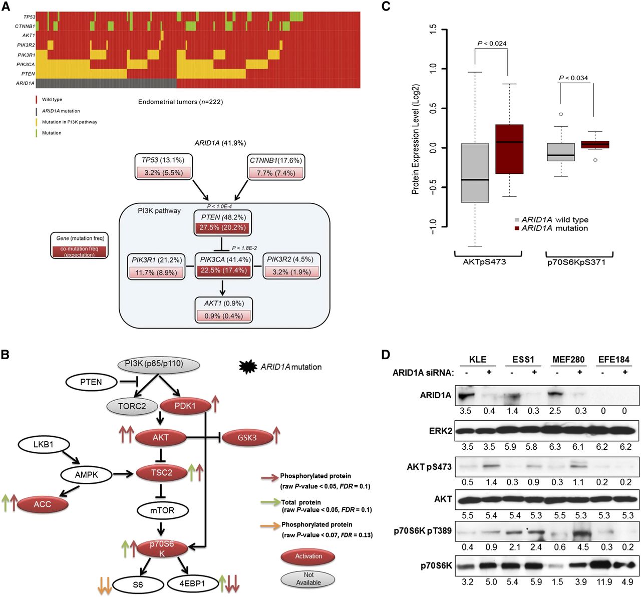 Mutational and functional analysis of ARID1A on the activation of the PI3K pathway. (A) Co-mutation patterns of ARID1A and key genes related to the PI3K pathway. (Upper panel) Mutation diagram in the full set of endometrial tumor samples (n = 222). Each column represents a tumor, and each row corresponds to a single gene. (Lower panel) Mutation or co-mutation frequencies are expressed as a percentage of all the samples, and the co-mutation frequencies from random expectation are shown in parentheses for comparison. (Dark red) Genes with statistically significant co-mutations, accompanied with Bonferroni-corrected P-values. (B) The functional effect of ARID1A mutation on protein expression of the PI3K pathway. Each arrow represents a protein marker with significant differential expression between ARID1A wild-type and mutated samples: (red arrows) phosphorylated proteins and (green arrows) total proteins with P < 0.05 (two-sided t-test, FDR < 0.1); (orange arrows) phosphorylated proteins with marginal significance P < 0.07 (FDR < 0.13). (Solid red) Activated genes; (solid gray) genes without available protein expression data. (C) The functional effect of ARID1A mutation on the phosphorylation of AKT and p70S6K in tumor samples in which both PTEN and PIK3CA genes are wild-type, and also PTEN expression is retained (n = 47). P-values were calculated based on a two-sided t-test. (Boxes) The distribution of individual values from the lower 25th percentile to the upper 75th percentile; (solid line in the middle) median values; (lower and upper whisker) fifth and 95th percentiles; (small circles) outlier data points. (D) Four endometrial cancer cell lines were transfected with 20 nM ARID1A siRNA or nonspecific siRNA and harvested after 72 h for Western blotting with the indicated antibodies. Numerical values below each lane of the immunoblots represent the quantification of the relative protein level by densitometry.