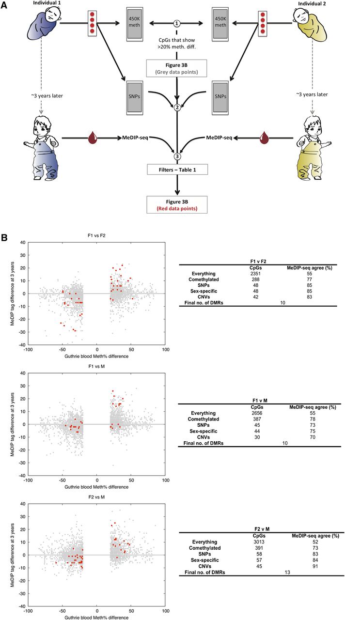 Identification at birth of temporally stable individual-specific DNA methylation variants. (A) Experimental strategy schematic: (1) Guthrie card Illumina450K profiles were generated and >20% interindividual pairwise methylation differences called (sex chromosome data were excluded from all analyses); (2) SNP data were also generated from Guthrie card DNA; (3) a variety of filters (detailed in Table 1) were applied to the Illumina450K profiles, and then validation was performed using MeDIP-seq profiles of blood sampled when the individuals were 3 yr old. (B) Identification of temporally stable interindividual DMRs that exist at birth. (Gray points) Single CpG interindividual differences of >20%; (red points) the filtered set. The number of CpGs remaining after each filter is indicated in the adjoining tables. The final sets of CpGs (red points in the figure) were grouped into “DMRs”—differentially methylated regions. Binomial P-values (calculated at a per-DMR level) for the “Agreement scores” between Illumina450K and MeDIP-seq data are: F1 vs. F2: P = 0.01, F1 vs. M: P = 0.11, F2 vs. M: P = 0.0003.