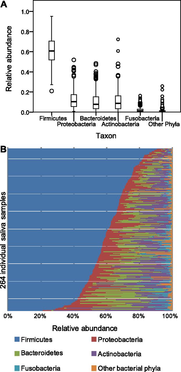 (A) Box-and-whiskers plot of the five major bacterial phyla of 264 human saliva samples. The top of the box represents the 75th percentile, the bottom of the box points to the 25th percentile, and the black line in the middle shows the median. The whiskers represent the highest and lowest values up to 1.5 times the interquartile range; extreme values and outliers are represented by empty circles. (B) Relative abundance of the five major bacterial phyla of all individual saliva samples, sorted by decreasing Firmicutes content.