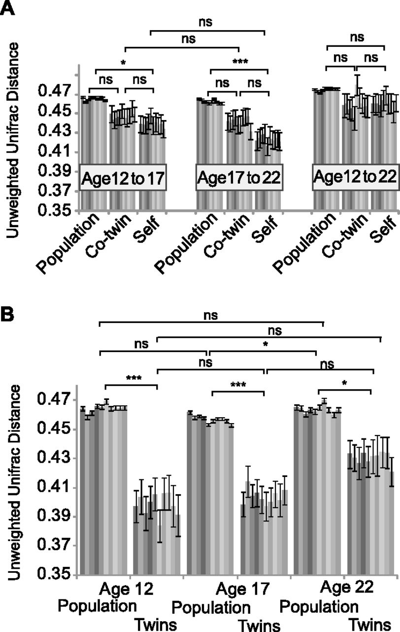 (A) Time progression of individuals, their twins, and the sample population at ages 12, 17, and 22. MZ and DZ pairs were pooled. Age 12–17: Population (n = 6165 pairs), Co-twin (n = 58 pairs), Self (n = 64 pairs); age 17 to 22: Population (n = 5060 pairs), Co-twin (n = 50 pairs), Self (n = 52 pairs); Age 12 to 22: Population (n = 3685 pairs), Co-twin (n = 28 pairs), Self (n = 34 pairs). (B) Similarities based on age of sampling (ages 12, 17, and 22 yr) of twins and the sample population. MZ and DZ pairs were pooled. Pairwise unweighted UniFrac distances of the same person, the person and his/her twin, and the sample population at different ages were calculated (±SEM). The data set was randomly subsampled 10 times at a sequencing depth of 800 sequences/sample. The statistical analysis was a Mann-Whitney U-test. The P-value outcomes are denoted as follows: (ns) nonsignificant, (*) P < 0.05, (**) P < 0.01, (***) P < 0.001. The P-value of each permutation was recorded, and the lowest significance level that has occurred in at least nine out of 10 rarefactions is presented.