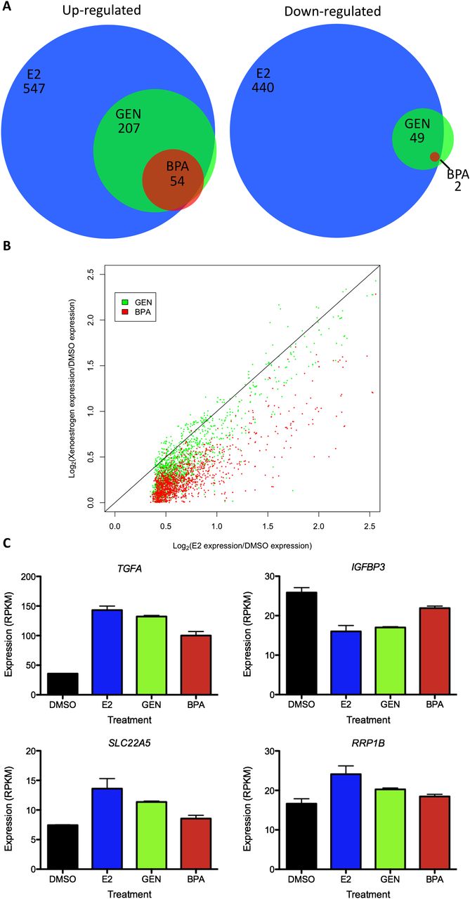 Gene expression changes in response to GEN and BPA. (A) The overlap between genes up-regulated (left panel) and genes down-regulated (right panel) by E2, GEN, and BPA. (B) A scatter plot shows the relative magnitude of gene expression changes with log2 of the fold change induced by E2 on the x-axis, and log2 of the fold change induced by GEN (green) and BPA (red) on the y-axis. The black line represents equal magnitude. (C) Examples of gene expression measurements in DMSO, E2, GEN, and BPA are shown for four representative genes. Error bars represent s.e.m.