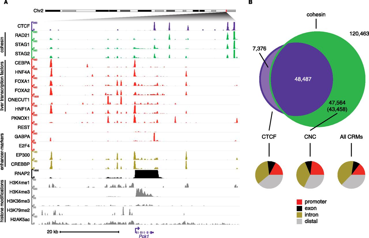 (A) Genome-wide occupancy of cohesin, CTCF, tissue-specific and ubiquitous TFs in primary mouse liver as measured by ChIP-seq and shown near the Pck1 gene. Cohesin colocalizes with CTCF as well as with clusters of transcription factors in the absence of CTCF, one of which can be seen overlapping the TSS of the Pck1 gene. (B) Venn diagram showing CTCF and cohesin (RAD21, STAG1, STAG2) occurrence within CRMs. The pie charts indicate genomic locations of all CRMs (background), as well as those containing CTCF and CNC. The latter occur within promoter regions at a higher relative frequency compared with the other two classes.