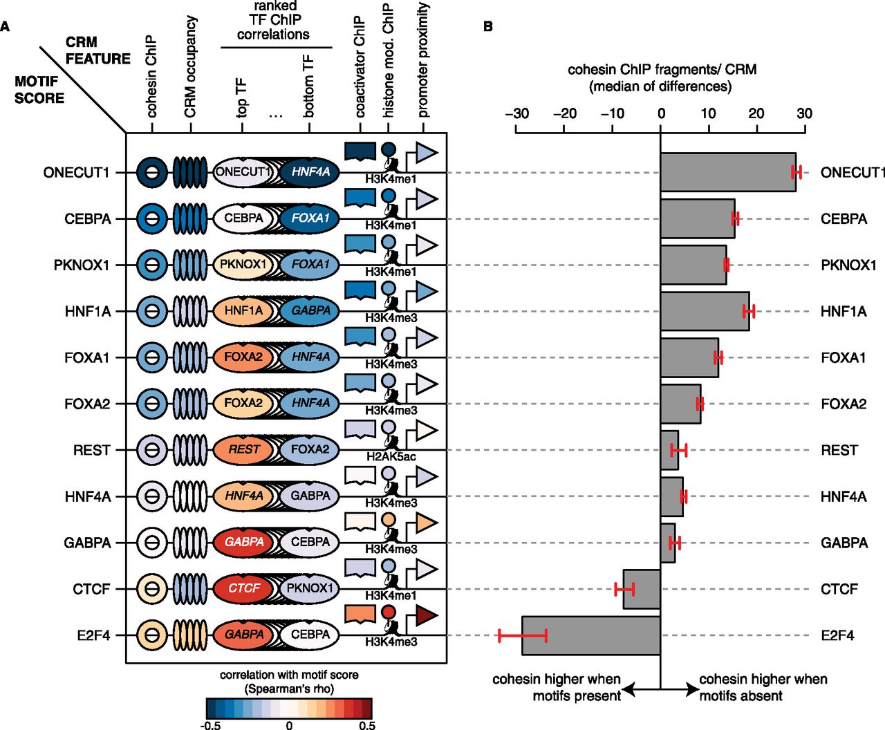 Cohesin ChIP signal is significantly associated with TF motif score. (A) Cartoon heatmap representation of correlations between each sequence-specific factor's motif score and the ChIP signal of all available ChIP-seq data sets. Correlations with CRM occupancy (number of distinct TFs present) and promoter proximity (distance to the nearest canonical TSS) are also shown. For each factor, the motif score correlation was calculated on the set of CRMs that contained a ChIP-seq peak for the same factor. Correlations with cohesin and coactivator ChIP signal were averaged over subunits (RAD21, STAG1, STAG2) and family members (EP300, CREBBP), respectively. Heatmap rows were ordered by increasing correlation with cohesin ChIP signal (from top to bottom). As a visual summary, only the top- and bottom-ranking correlations involving TFs are shown (see Supplemental Figs. S6, S7 for all correlations). (B) Increased cohesin ChIP signal at TF binding events without motifs. For each sequence-specific factor, the number of cohesin ChIP fragments within CRMs without high-scoring motifs was compared with that of CRMs with motifs. The 95% confidence intervals shown are based on a normal approximation of the Hodges–Lehmann estimate (median of all possible differences).