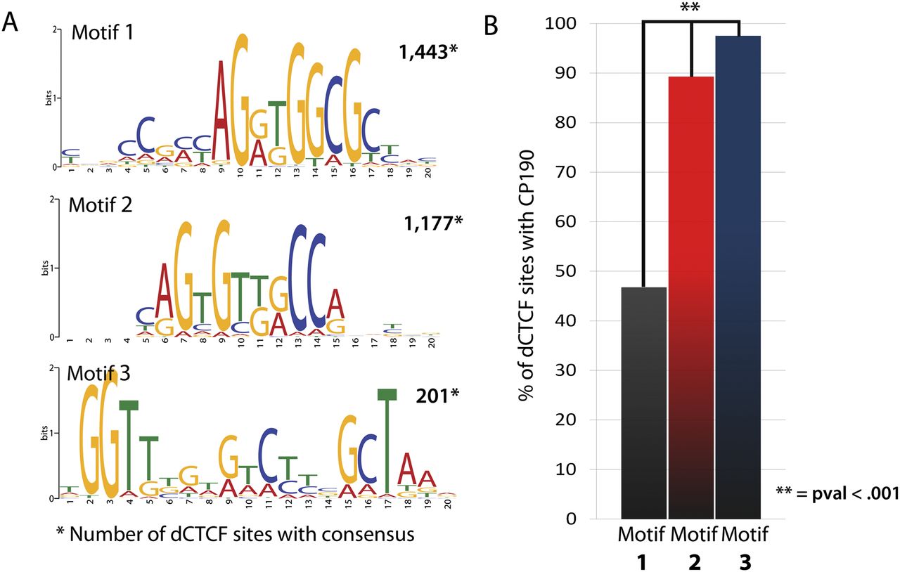 dCTCF sites are enriched for three distinct DNA motifs, including a similar but novel secondary motif enriched for insulator protein CP190. (A) Position weight matrices for primary target sequence and secondary target sequences obtained by MEME-ChIP, and confirmed with Weeder 1.3. Number of sites provided represents sites in which dCTCF summits are ±150 bp from the DNA motif. (B) Percentage of dCTCF sites in which CP190 is present when containing each DNA motif.
