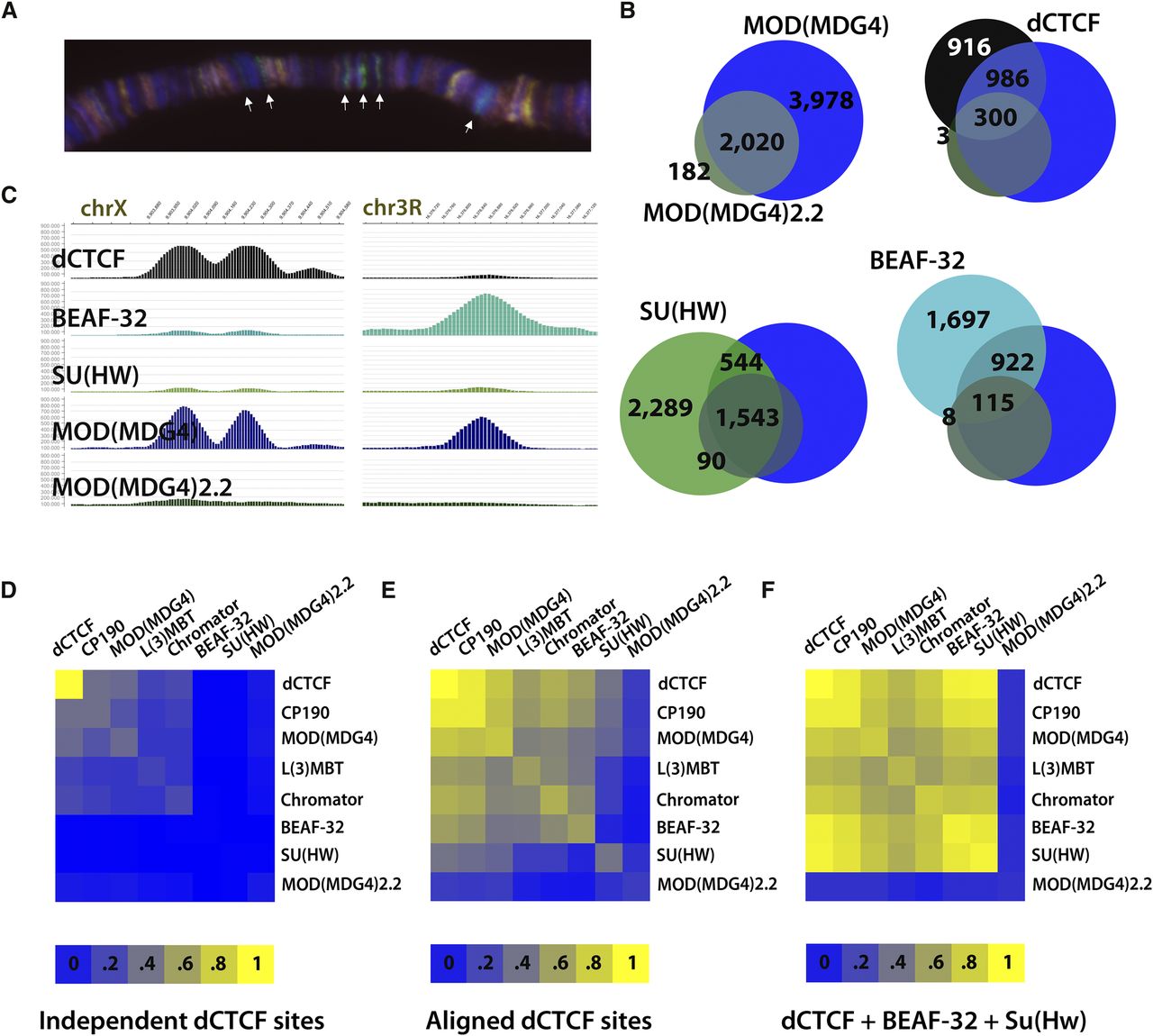 dCTCF and BEAF-32 recruit isoform(s) of MOD(MDG4) different from MOD(MDG4)2.2. Aligned dCTCF sites are enriched for MOD(MDG4) and additional cofactors. (A) Immunofluorescence microscopy of MOD(MDG4) (green) and MOD(MDG4)2.2 (red) on Drosophila polytene chromosomes. MOD(MDG4) staining includes many discrete bands not accounted for by MOD(MDG4)2.2 specific antibodies, depicted with white arrows. (B) Genome-wide overlap of dCTCF, BEAF-32, and SU(HW) with MOD(MDG4) and MOD(MDG4)2.2. Many dCTCF (45%) and BEAF-32 (34%) sites overlap MOD(MDG4) isoform(s) not represented by MOD(MDG4)2.2. Meanwhile, many SU(HW) (37%) sites overlap MOD(MDG4)2.2 sites, as expected. (C) ChIP-seq profile for MOD(MDG4) and MOD(MDG4)2.2 reveals many unique peaks specifically in the MOD(MDG4) profile, accounted for at BEAF-32 and dCTCF sites. (D–F) Heatmap representation of percentages of dCTCF sites in which CP190, MOD(MDG4), MOD(MDG4)2.2, BEAF-32, SU(HW), L(3)MBT, and/or Chromator co-occur at independent dCTCF sites, aligned dCTCF sites, and sites where dCTCF aligns with both BEAF-32 and SU(HW).