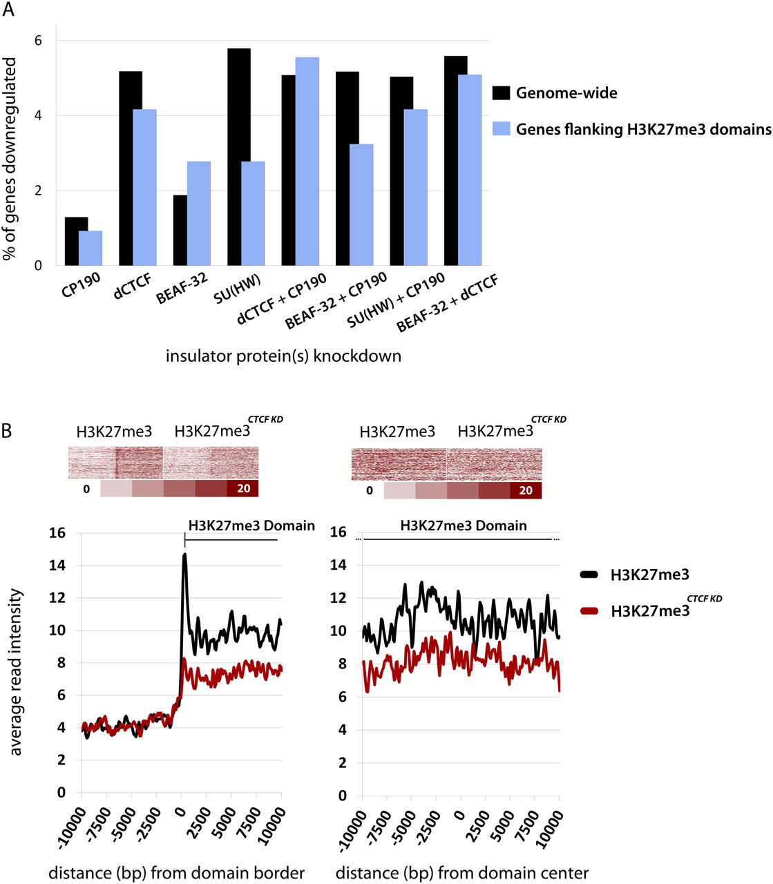 RNAi depletion of insulator proteins causes H3K27me3 depletion within domains but has no effect on H3K27me3 domain flanking genes. (A) Percentage of genes down-regulated (more than twofold) in Drosophila Kc cells after knockdown of insulator protein expression. Comparison of genes flanking H3K27me3 domains with genome-wide averages. (B) Average read intensity for H3K27me3 in Drosophila Kc cells at domain borders and surrounding domain centers. H3K27me3 levels were determined by ChIP-seq before and after dCTCF knockdown. For appropriate comparison, ChIP-seq data for H3K27me3 was rank normalized as previously described (Whyte et al. 2012) and represented as average read intensity.