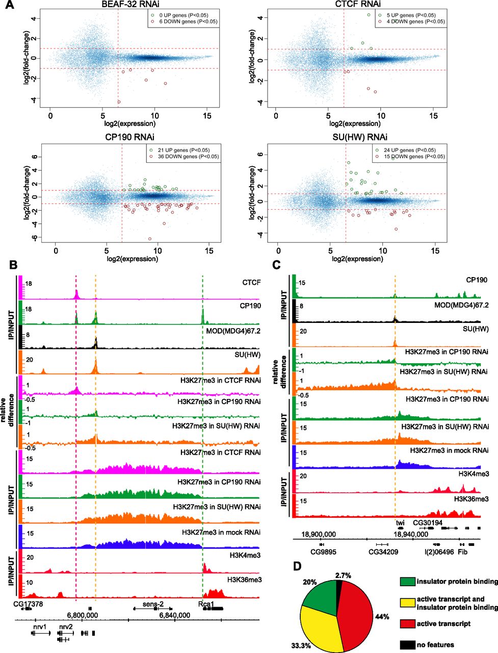 Functional effects of insulator protein withdrawal. (A) Affymetrix GeneChip expression analysis of cells from the RNAi experiments described in Figure 3. The average fold change between the two specific and two mock RNAi experiments (y-axes) was plotted against the highest average expression value detected in the mock or specific RNAi samples (x-axes). Each graph point represents one transcript interrogated by the microarray. Transcripts robustly expressed before or after specific RNAi treatment are to the right of the vertical dashed lines. Of these, those showing consistent twofold or greater change after specific RNAi treatment in both replicate experiments are circled. (B) As evident from ChIP-chip of H3K27me3 from mock RNAi-treated BG3 cells, the sens-2 gene is repressed by PcG. The right border of the corresponding H3K27me3 domain is sharp and coincides with a standalone CP190 site (marked by a vertical green dashed line) and with the Rca1 transcript. The ChIP-chip with H3K4me3 and H3K36me3 indicates that Rca1 is transcriptionally active. The left side of the H3K27me3 domain declines gradually with no obvious border. It harbors gypsy-like and CTCF+CP190 binding sites marked by orange and purple dashed lines, respectively. The knock-downs of insulator proteins have no effect on the position of the right border of the H3K27me3 domain but change the shape of its left tail. The changes in histone methylation profile are best seen on the relative difference browser tracks. (C) twi is also repressed by PcG mechanisms in BG3 cells. The right border of the corresponding H3K27me3 domain is set by the presence of an active transcript. The left border is maintained by a gypsy-like (class 3) insulator (vertical orange dashed line), as evident from the extension of K27 trimethylation after SU(HW) or CP190 knock-down. (D) The pie chart shows the frequencies of various genomic features associated with definable H3K27me3 domain borders.
