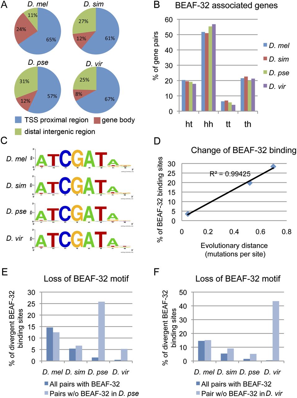 Conservation and divergence of BEAF-32 sites in Drosophila species. (A) Distribution of BEAF-32 binding sites with respect to various gene landmarks. (B) Percentage of various gene pair combinations flanking BEAF-32 binding sites; (ht) head-to-tail; (hh) head-to-head; (tt) tail-to-tail; (th) tail-to-head. BEAF-32 association with head-to-head gene pairs is conserved. (C) Consensus motif for BEAF-32 occupied sequences in the four species. (D) Correlation of BEAF-32 binding divergence with evolutionary distance between D. melanogaster and other species. (Y-axis) Percentage of BEAF-32 binding sites that are not conserved in the other three species with respect to all BEAF-32 binding sites in D. melanogaster. (E,F) Species-specific loss of BEAF-32 binding associates with species-specific loss of the BEAF-32 motif in the DNA sequence. (Dark blue bars) Background absence of the BEAF-32 motif for all BEAF-32-associated gene pairs in each species. (Light blue bars) Absence of the BEAF-32 motif for a group of gene pairs with BEAF-32 binding lost only in D. pseudoobscura (E) or only in D. virilis (F).