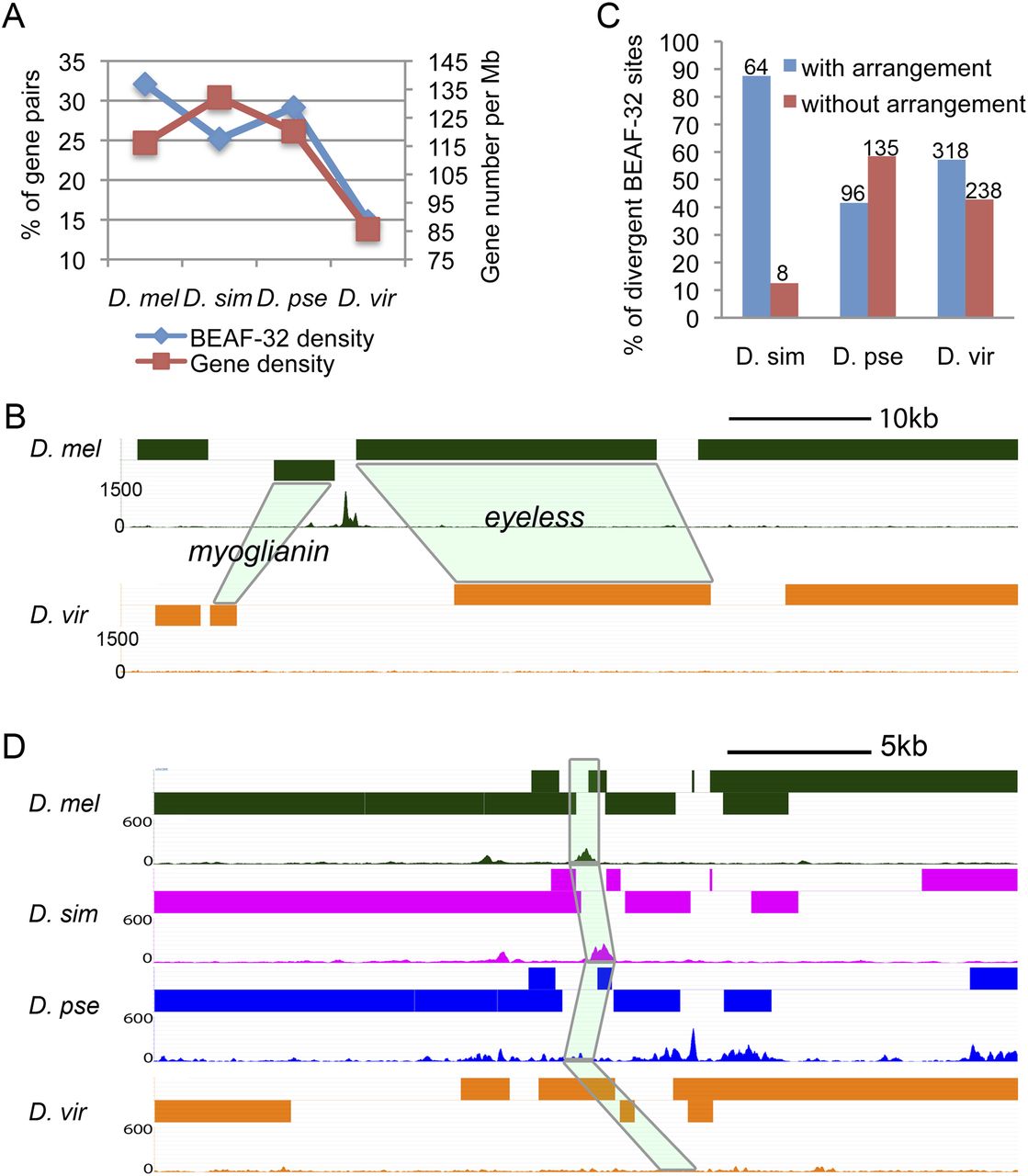 Changes in BEAF-32 binding correlate with changes in genome organization and function. (A) BEAF-32 density decreases as gene density declines. (Left y-axis) Percentage of gene pairs containing BEAF-32 with respect to all well-mapped gene pairs and is a measure of BEAF-32 density. (Right y-axis) Number of genes per megabase as a measure of gene density. (B) Arrangement of the myoglianin and eyeless genes and location of BEAF-32 binding sites. Light-green shadowing indicates the orthologous genes in D. virilis. (C) Percentage of divergent BEAF-32 binding sites that either associate or do not associate with chromosome rearrangement between D. melanogaster and the species listed. The numbers above the bar indicate the number of cases in each category. (D) An example of gene arrangement and location of BEAF-32 binding sites in a region whose mutation affects body size in D. melanogaster is shown for four different species. The mutation affecting body size results in alteration of sequences in the intergenic region encompassing the BEAF-32 binding site in D. melanogaster. Light-green shadowing represents the four orthologous regions in each of the Drosophila species.