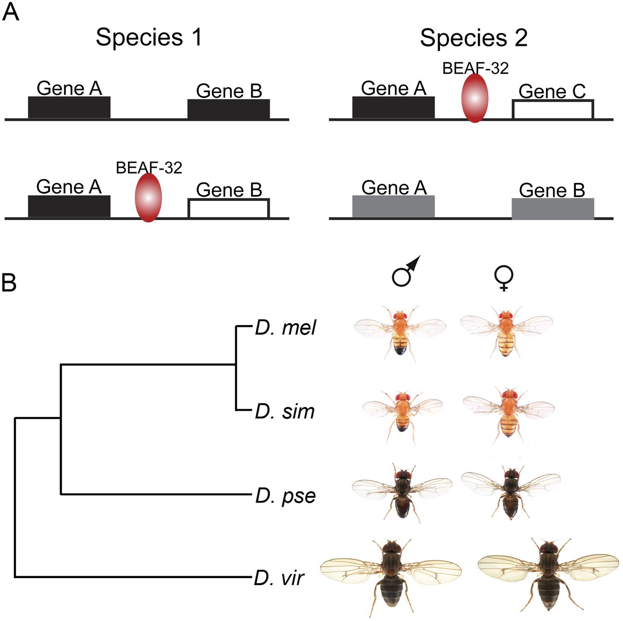 Simplified models for the role of BEAF-32 during evolution of Drosophila species. (A) Two alternative possibilities explaining how alterations in BEAF-32 binding may affect transcription. Blocks indicate genes. (Black and white) Different transcription regulatory modes of the genes. (Gray) Converged regulation for the two genes. Gain or loss of BEAF-32 binding when gene pairs are reorganized to maintain proper transcription (top). Gain or loss of BEAF-32 binding when gene organization does not change to create transcription diversity (bottom). (B) Phylogeny and phenotype of Drosophila species analyzed in this study.