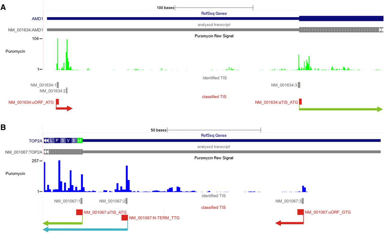 Gene-based examples for the annotation of TIS for the AMD1 (A) and TOP2A (B) genes in the presented data set: Screenshots from the online resource (the annotation tracks at http://gengastro.1med.uni-kiel.de/suppl/footprint/) are provided. The network-identified TISs are marked in gray and are numbered consecutively along the genome assembly for each RefSeq sequence. The classification results of TIS according to the algorithm in Figure 2 are noted in red. In addition to the markings provided in the online resource, the open reading frames are highlighted with red arrows for uORFs, a blue arrow for the N-terminal protein extension of TOP2A, and green arrows for the annotated CDS of the two genes. (A) Previously known uORF at network-predicted TIS NM_001634:1. An additional internal network-predicted TIS is present in this uORF and was thus not annotated independently as noted in the results. (B) A novel uORF at network-predicted TIS NM_001067:3 and a novel N-terminal protein extension at network-predicted TIS NM_001067:2 are shown. The annotated AUG TISs are detected in both genes.