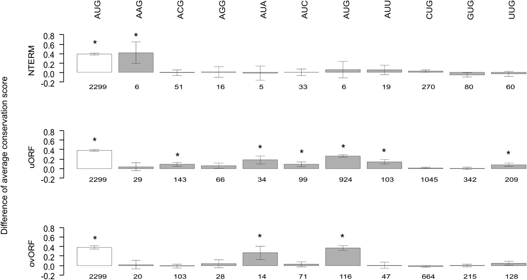 Primate conservation analysis of TICs at neural network-predicted TISs. For each functional category and codon type, the difference in mean Conservation Score in nine primate species (with 95% confidence interval) is depicted between case and control TICs. For comparison, the difference in mean Conservation Score for the annotated AUG TICs (open box) is also included for each category. Numbers below boxes refer to the number of predicted TIS falling into the respective TIS by TIC category. TICs showing statistically significant conservation after Bonferoni correction (31 tests, P < 0.0016) are marked by an asterisk. Further details of the primate conservation analysis are provided in Supplemental Table 3.